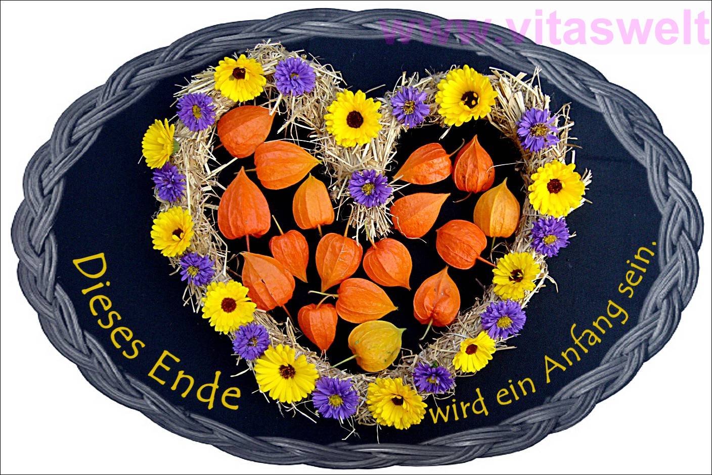 | T15 „Dieses Ende wird ein Anfang sein.“ steht im Halbkreis unter einem Strohherz geschrieben, das aus Draht gebogen und mit Stroh umwickelt wurde. Dieses liegt auf einem schwarzen Hintergrund. In der Mitte ist das Herz gefüllt mit vielen orange leuchtenden Lampignonfrüchten. Auf das Strohherz habe ich abwechselnd die Blüten von lila Astern und gelben Arnikablüten gelegt. Die Karte hat eine ovale Form und der Rand ist wie ein Weidenkorb geflochten. Mail mit der Karte T15 versenden Karte T15 bestellen Karte T15 vergrößern | |