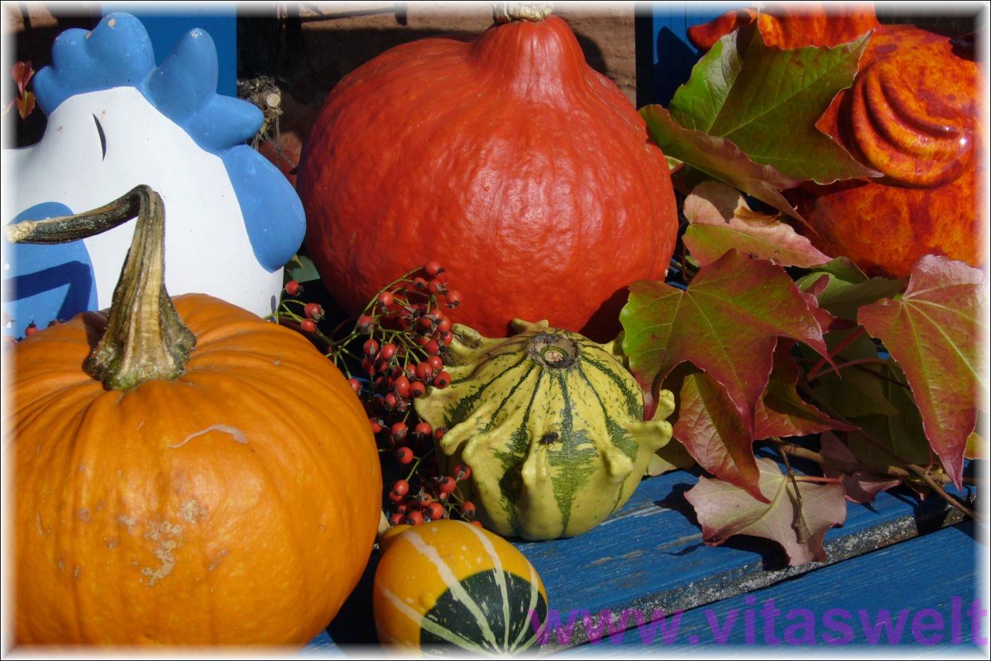 | T16 Hier wurde ein Kürbisarrangement auf einer blau gestrichenen Bank fotografiert. Zwischen den Kürbissen hat sich der Ast eines rotblättrigen Weines niedergelegt. Zwischen einem ogangegelben und einem orangeroten Kürbis liegen zwei kleinere gelb- grüne Zierkürbisse mit bizarren, birnenförmigen Formen. Am linken Rand schaut ein weiß-blauer Hahn aus Keramik zwischen der Anordnung frech über alles hinweg. Vor ihm liegen einige rote Beeren am Ast. Farbenfrohe Karte. Mail mit der Karte T16 versenden Karte T16 bestellen Karte T16 vergrößern | |