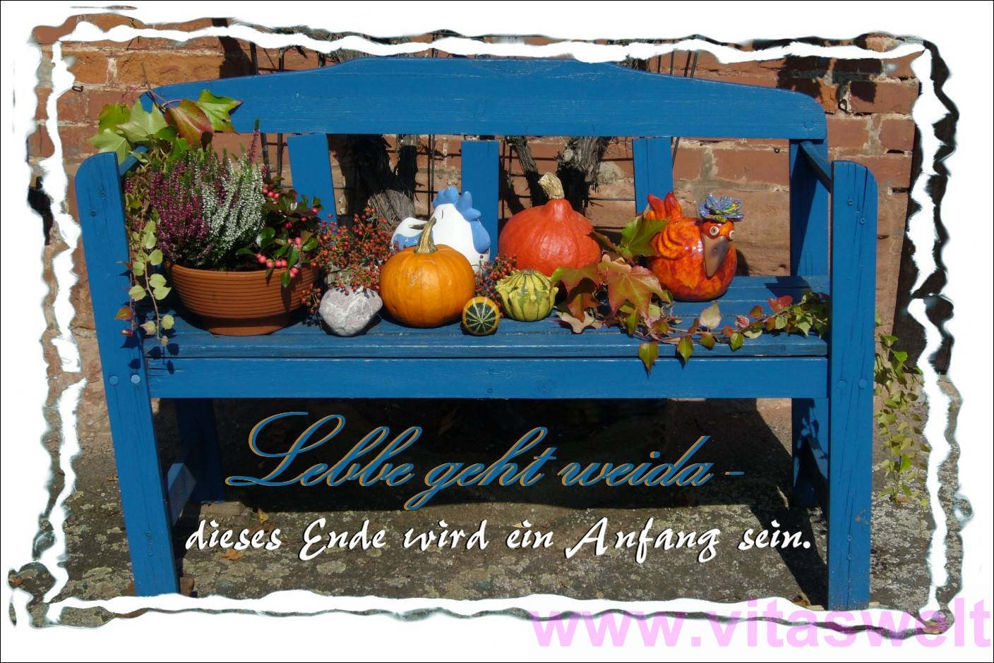 | T17 „Lebbe geht weida- dieses Ende wird ein Anfang sein.“ Steht in blauer und weißer Schrift unter der blauen Bank (Karte T16), die hier im Ganzen fotografiert wurde. Durch den größeren Bildausschnitt sieht man links und rechts des beschriebenen Arrangements noch eine Tonschale mit blühenden, lila-weißen Erika, sowie weitere Weinranken links und rechts. Außerdem steht ein weiterer Hahn am rechten Rand der Bank. Er ist rostrot. Die Bank steht vor einer Sandstein-Backstein Wand und wird von der Sonne beschienen. Der Kartenrand ist ungleichmäßig gewellt. Mail mit der Karte T17 versenden Karte T17 bestellen Karte T17 vergrößern | |