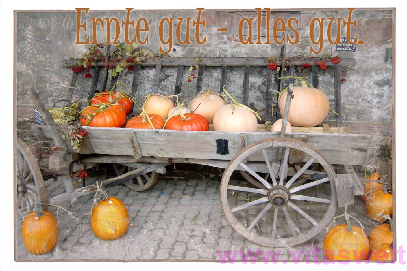 | T18 „Ernte gut- alles gut.“ Steht in brauner, alter Schrift über dem Foto eines alten Erntewagens mit Holzrädern und Holzachse. Auf diesem schönen Wagen, der vor einer Sandsteinmauer eines Gehöftes steht, liegen mehrere riesige gelbe und orangene Kürbisse, die mit den Armen gerade noch zu umfassen sind. Hier und da ist der Erntewagen mit Zweigen von roten Beerenfrüchten geschmückt und links und rechts am Boden liegen weitere Kürbisse. Liebevoll gestaltet von einer Familie aus unserem Nachbarort, die dort jedes Jahr Kürbisse und andere Ernteprodukte des Jahres verkaufen. Mail mit der Karte T18 versenden Karte T18 bestellen Karte T18 vergrößern | |