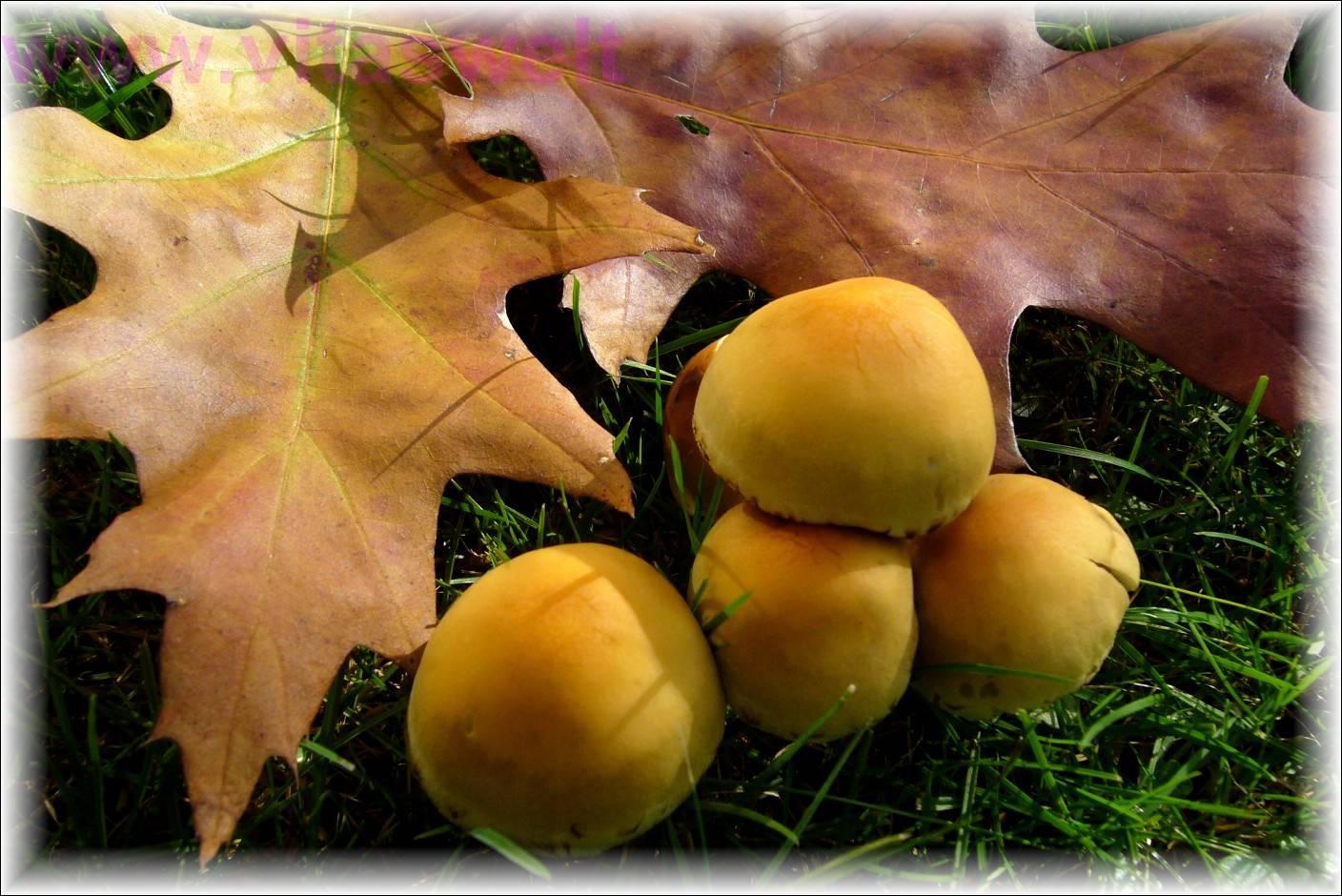 | T19 Vier unterschiedlich große, goldbraune Pilze schmiegen sich auf einer Wiese stehend eng aneinander. Dahinter rahmen zwei schön gefärbte und gezackte Ahornblätter die Pilzfamilie ein. Das eine Blatt ist eher gelb-braun, das andere rot-braun. Die Farben der Pilze harmonieren prächtig dazu. Von schräg hinten fällt Sonnenlicht auf dieses Arrangement, wodurch zieliche Schattierungen entstehen. Der Rand ist blasser werdend, wie Nebel. Mail mit der Karte T19 versenden Karte T19 bestellen Karte T19 vergrößern | |
