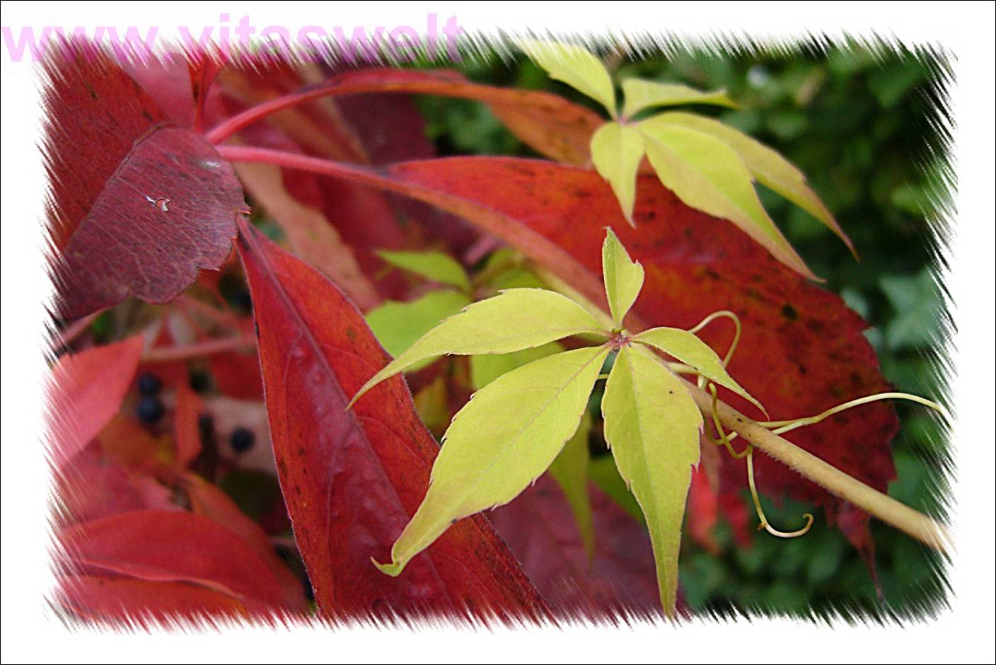 | T20 Ein wilder Wein mit 5 gezackten, bereits roten Blättern steht in Nachbars Garten. Zwei kleinere, noch gelbe Blättchen heben sich kontrastreich im rechten Bildrand vom Rot der übrigen Pflanze ab. Dieser Wein braucht eine Kletterhilfe und hat krakenarmige „Fühler“ mit denen er sich festhält. Zwei dieser hellgrünen Fühler kringeln sich zum rechten Bildrand hin. Der Hintergrund ist bewusst unscharf dunkelgrün. Der Kartenrand ist fein gestrichelt. Mail mit der Karte T20 versenden Karte T20 bestellen Karte T20 vergrößern | |