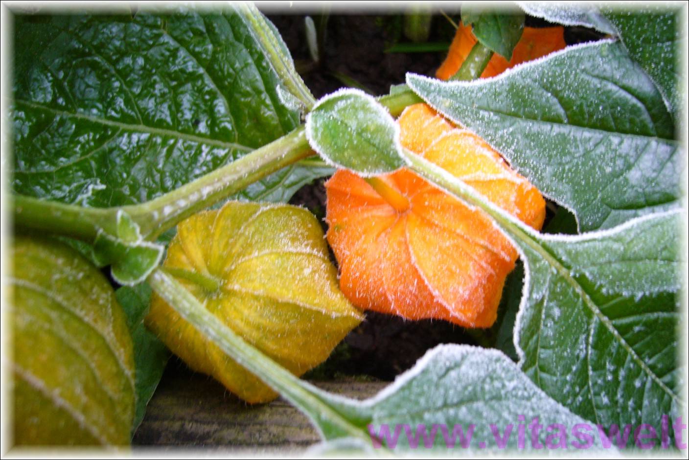 | T21 Rauhreif bedeckt die grünen Blätter und orange-gelben Früchte einer Lampignonpflanze. Eine feine, weiße Schicht, die vor allem an den Blatträndern und den Kanten der Früchte sichtbar wird. Erfrischend kalt. Mail mit der Karte T21 versenden Karte T21 bestellen Karte T21 vergrößern | |