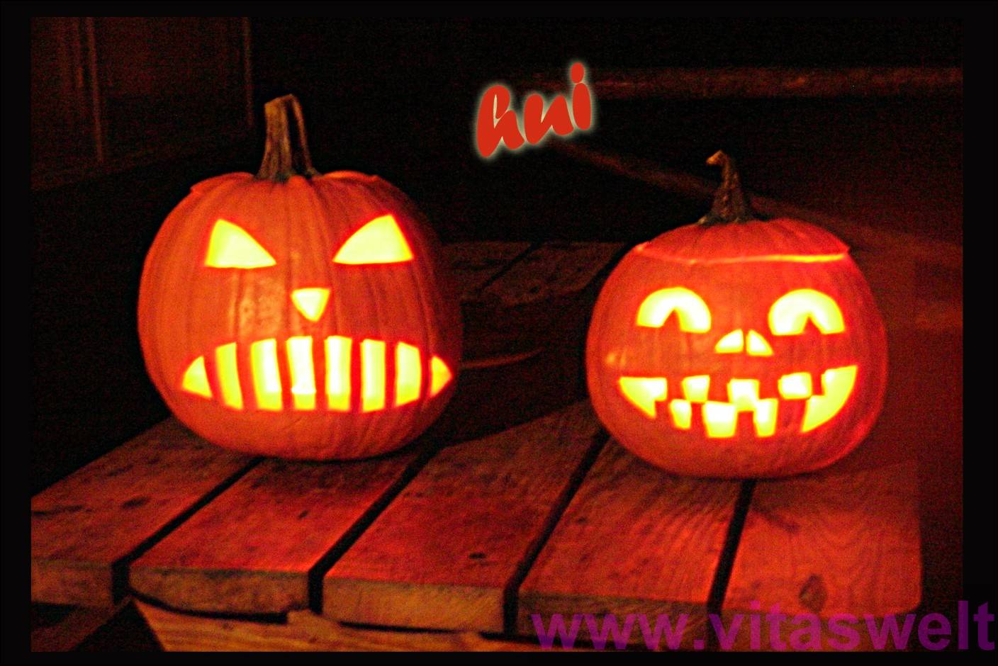 | T22 "hui" mehr steht nicht zwischen und über den beiden ausgehölten, orangenen Kürbissen, die jeweils unterschiedlich gruselige, ausgeschnitzte Gesichter haben. Augen, Zähne und Nase leuchten hellgelb auf, da in den Kürbissen eine Kerze brennt. Hintergrund nachtdunkel. Schriftzug Kürbisfarben. Die orange- gelb leuchten- den Stimmungsbomben liegen auf einem hölzernen Brettertisch. Wittzig und "gefährlich" Mail mit der Karte T21 versenden Karte T22 bestellen Karte T22 vergrößern | |