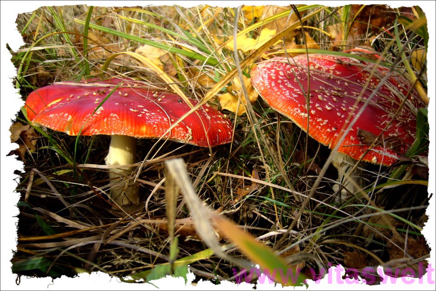 | T23 Während unseres Spaziergangs sah ich etwas rötliches unter dem verdörrten Gras am Wegesrand schimmern. Vorsichtig drückte ich dieses zur Seite. Zum Vorschein kamen zwei feurig rote Fliegenpilze, die bekanntlich weiße Sprenkel haben. Die zwei Tellerförmigen Hütchen waren etwa 18 cm im Durchmesser. Ich versuchte das warme Licht der Untergehenden Sonne zu nutzen und legte mich mit der Kamera fast ins Gras. So bekam ich die Szene aus einer tollen "Käferperspektive" Die weißlichen Stiele und das wirre Gras, mal grün, mal vertrocknet gelb bieten einen tollen Kontrast zum Rot der Hütchen, von dem das rechte etwas schräg nach rechts abfällt. Kartenrand wie ausgefranst-passend zum Gras. Schön, giftig. Mail mit der Karte T23 versenden Karte T23 bestellen Karte T23 vergrößern | |