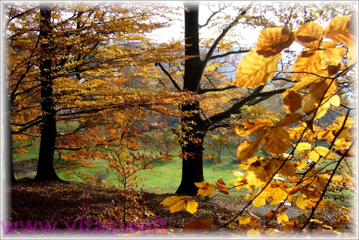 | T24 Hier blickt man durch gelbgoldene, von der Sonne beschienene Buchenblätter, Buchenstämme und Äste auf eine noch saftig grüne Wiese und einen leicht bedeckten Himmel. Das Licht und Schattenpiel der sich bewegenden Blätter im Wind macht diese Ansicht so interessant. Der Waldboden ist schon ganz mit Laub bedeckt. Sonnendurchflutete, auffrischende Stimmung für trübe Tage. Mail mit der Karte T24 versenden Karte T24 bestellen Karte T24 vergrößern | |