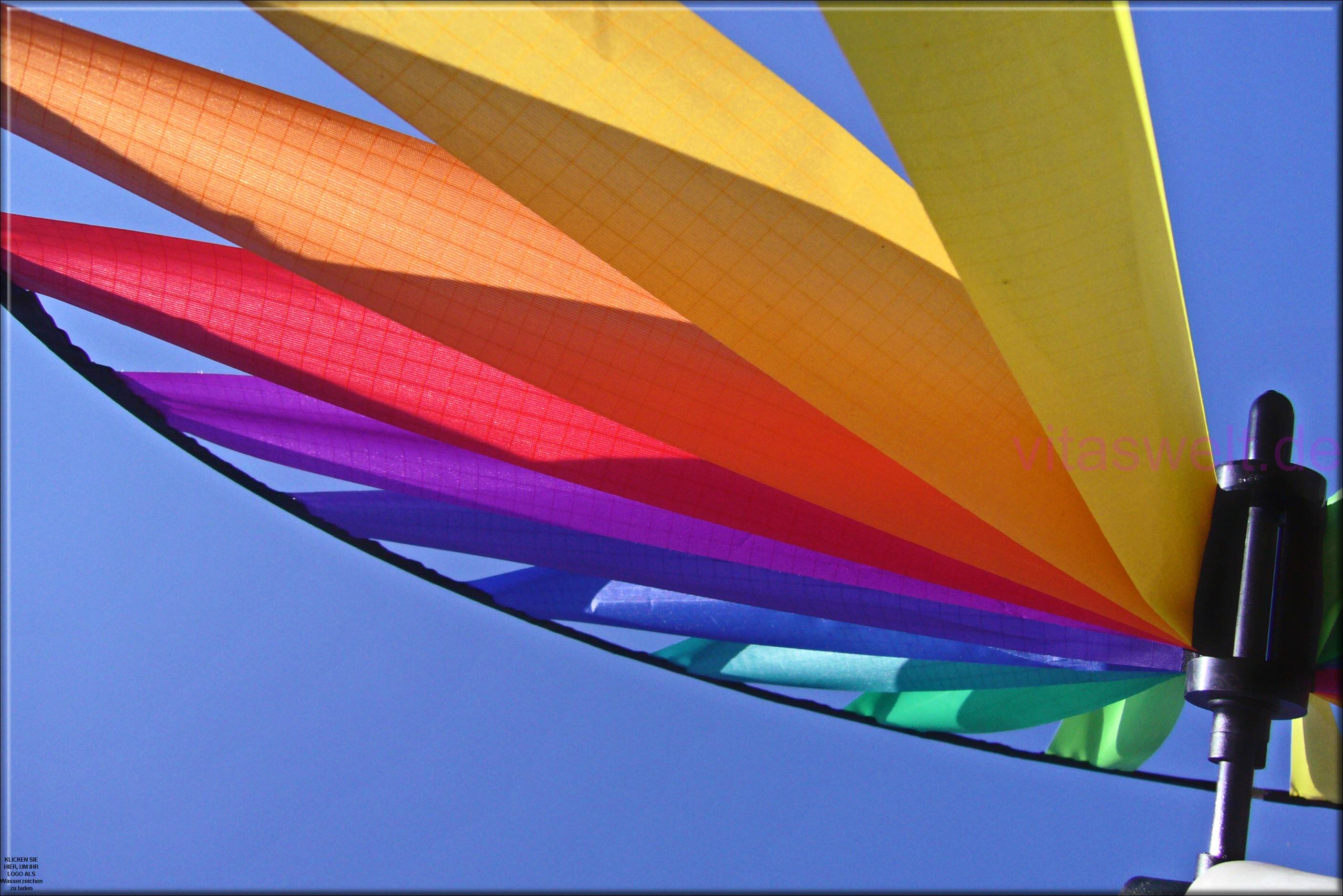 | T28 Ein Windrad mit 60 cm Durchmesser drecht sich in unserem Garten. Die "Speichen" sind aus Zeltstoff, wobei jede Speiche einen anderen farbton hat. Insgesamt wiederholen sich die Regenbogenfarben. Die Perspektive wählte ich von unten. So konnte ich den blauen Himmel als Hintergrund nutzen. Vom Rad ist etwa die Hälfte schräg abgeschnitten zu sehen. Knackige Farben, interessanter Ausschnitt. Vielleicht versenden mit: Lass uns mal wieder durchdrehen? Mail mit der Karte T28 versenden Karte T28 bestellen Karte T28 vergrößern | |