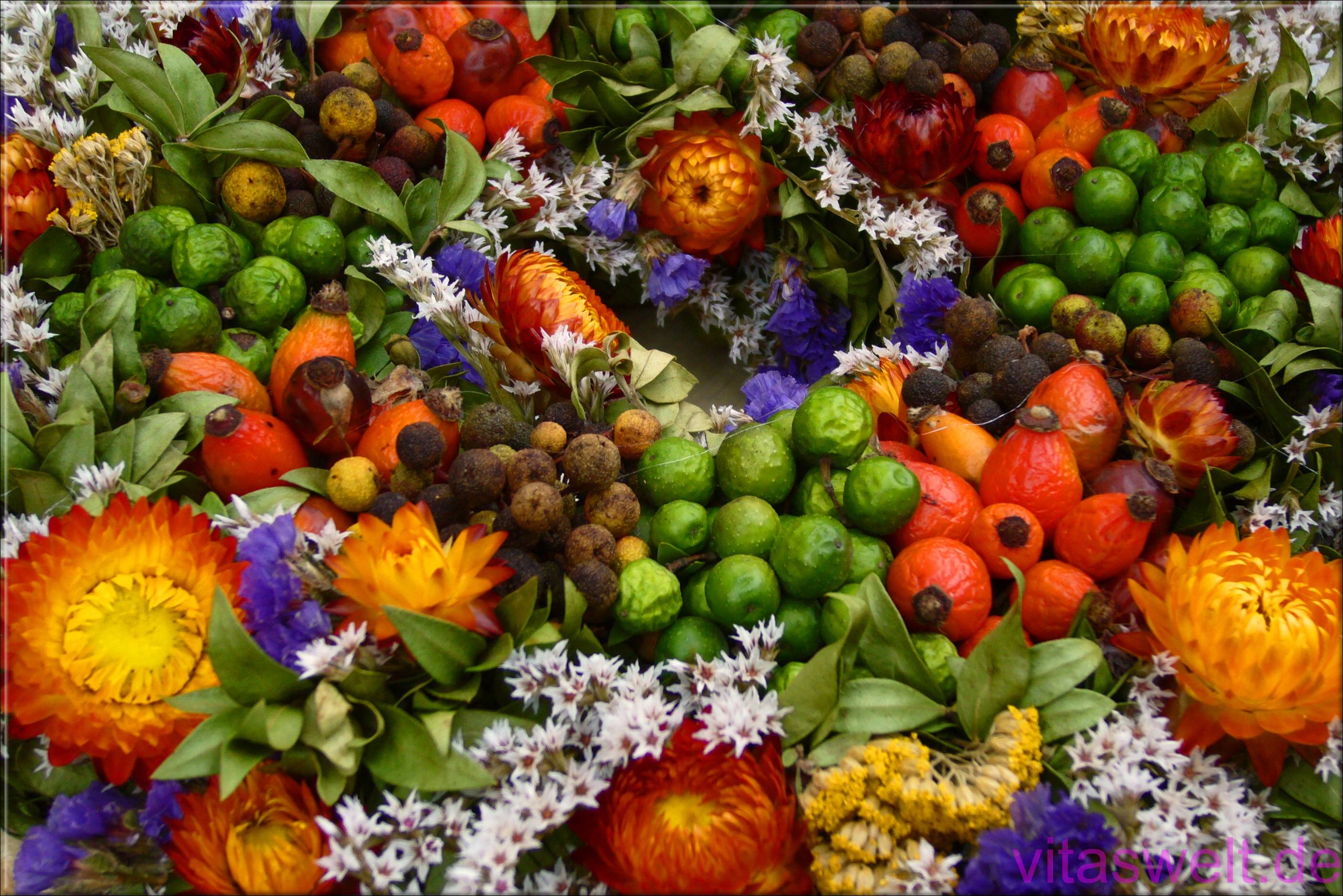 | T29 **Auf dem Bauernmarkt fand ich diesen bunt geschmückten Herbstkranz aus roten, grünen und braunen Früchten, sowie weißem Schleierkraut, orange-gelben, blauen und gelben Trockenblumen. Die Detailaufnahme verdichtet die Komposition zu einem prallen Gesamtbild. Die schöne Seite des Herbstes. Mail mit der Karte T29 versenden Karte T29 bestellen Karte T29 vergrößern | |