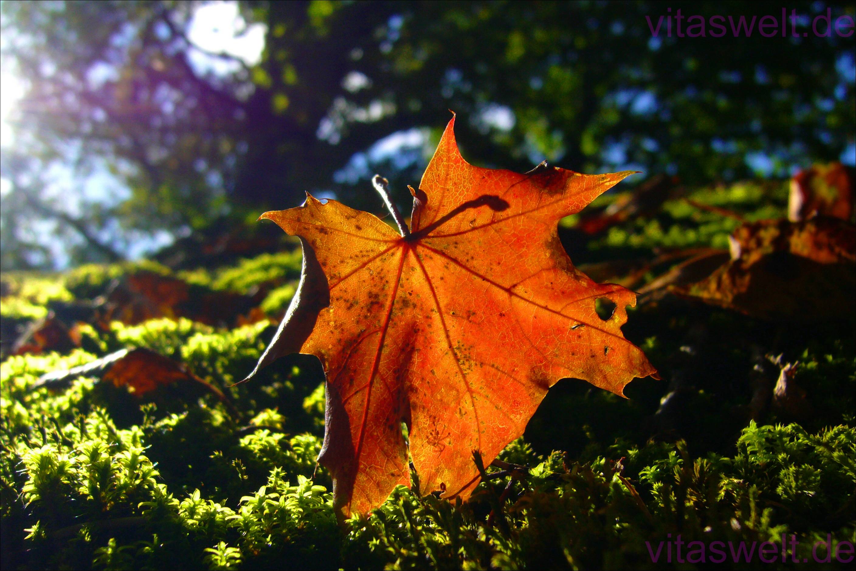 | T30** Im Gegenlicht der morgendlichen Sonne wird dieses rötliche Spitzahornblatt vom Licht durchflutet. Es scheint mit seinen spitzen Blatträndern im Moos stecken geblieben zu sein, so dass es senkrecht zum glänzend schimmernden moosbedeckten Boden steht. Im Hintergrund blinzelt die Sonne und der blaue Himmel durch die Äste eines kräftigen Baumes. Die gezackten Blattränder beginnen sich zu rollen und die Wasseradern des Blattes verzieren es von innen. Entdeckt bei einem einsamen Morgenspaziergang im Freiburger Herbst. Mail mit der Karte T30 versenden Karte T30 bestellen Karte T30 vergrößern | |