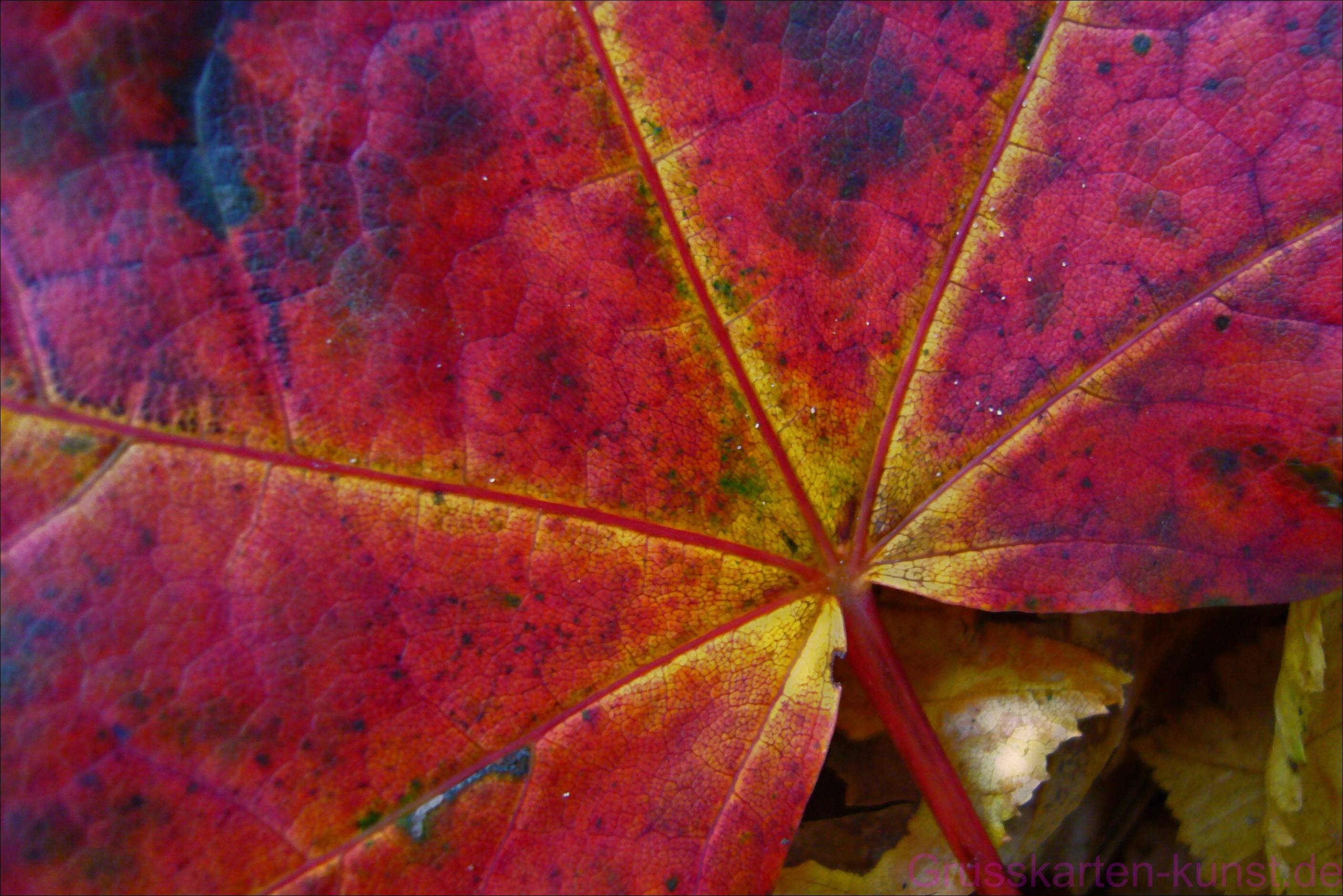 | T31 Nahaufnahme eines rot leuchtenden, fleckig durchsetzten Ahornblatt- Ausschnittes. Der rote Stiel endet in der rechten, mittleren Bildhälfte. Von diesem Blattansatz verzweigen sich strahlenförmig 7 Wasser tragende Hauptadern, die schon gelblich schimmern. Immer wieder schön. Mail mit der Karte T31 versenden Karte T31 vergrößern | |