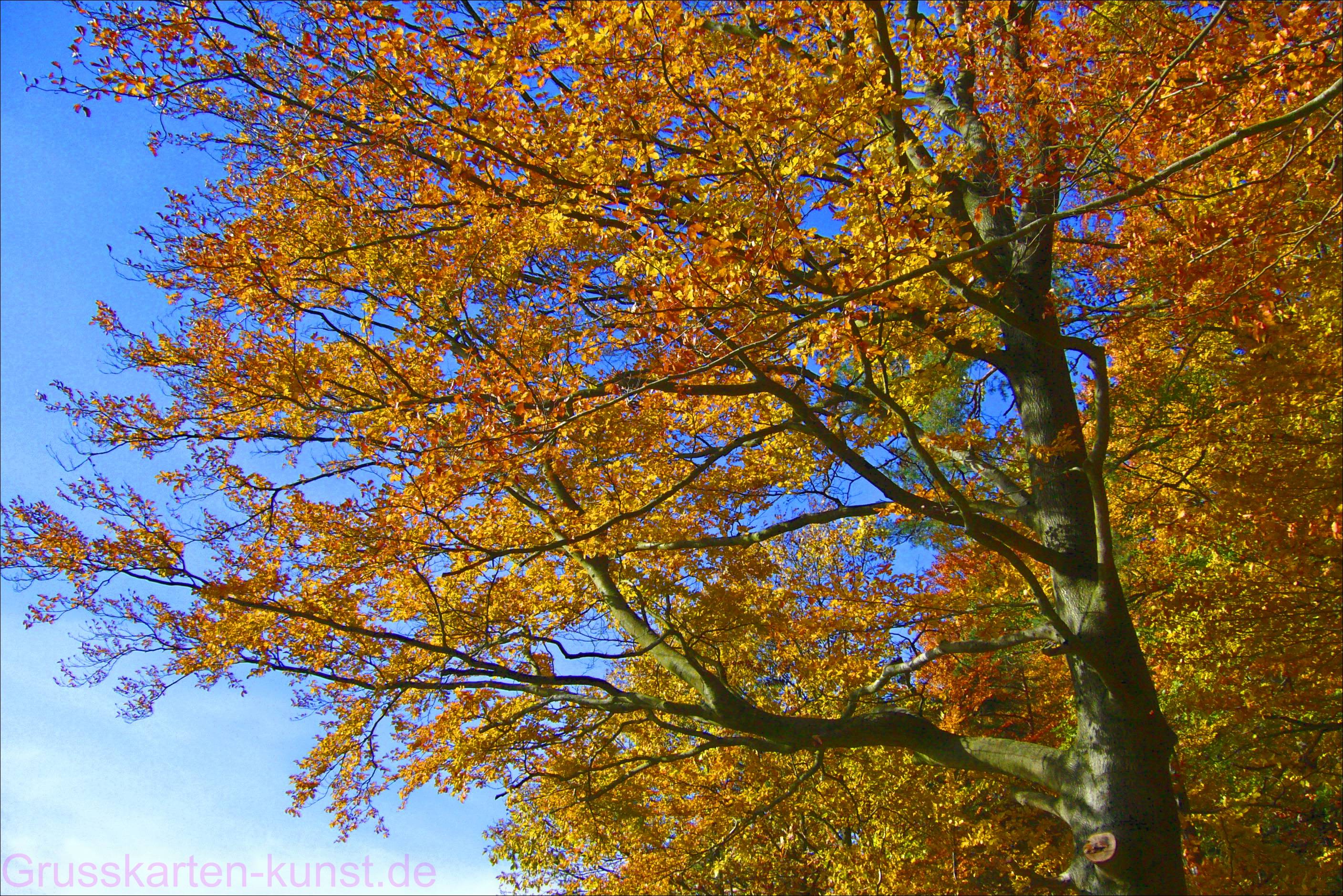 | T32 Ausschnitt einer Buchenkrone mit von der Sonne angestrahlten gelb-goldenen, bis ins rot gehenden, Blättern vor blauem Himmel. Deutlich sieht man auch die Verzweigungen der Äste, die vom Hauptstamm abgehen. Ja, das nennt man goldener Oktober. Mail mit der Karte T32 versenden Karte T32 vergrößern | |