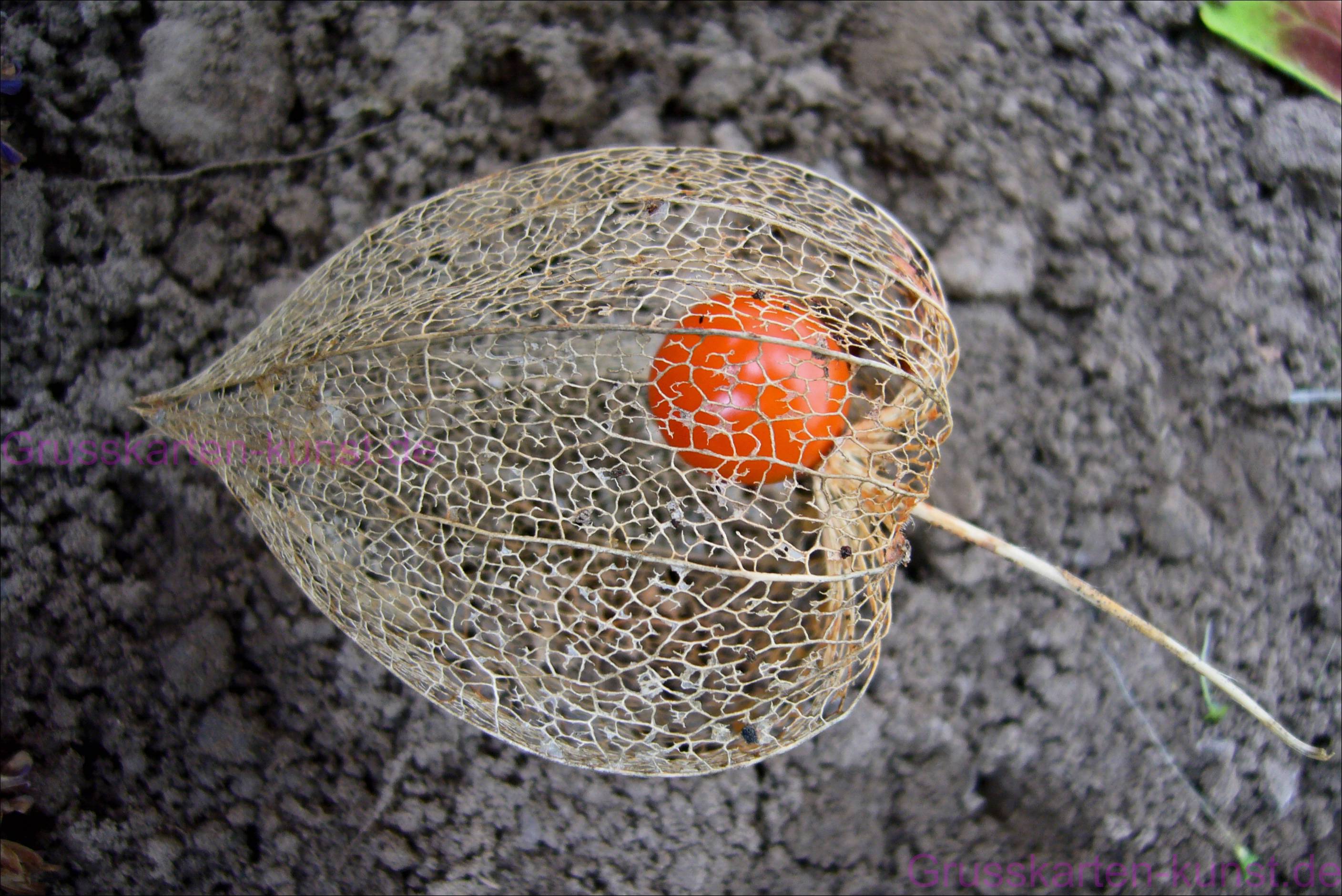 | T06 „Alles hat seine Zeit." Braun-orangener Schriftzug oben auf der Karte. Auf der Quer zu lesenden Karte habe ich links und rechts jeweils hochkant die Fotografie einer Lampignonpflanze eingefügt. Diese Pflanze hat einen etwa 50 cm langen Stiel, von dem aus sich einzelne Blätter und Blüten verzweigen. Nach der Blüte bilden sich sogenannte Lampignons. Eine etwa walnussgroße Frucht, die innen hohl ist. Die Frucht ist im Mai/Juni grün (linkes Bild), ist oben rundlich dick und verjüngt sich nach unten zu einer Spitze. Etwa im August beginnen sich die Früchte orange zu färben (rechtes Bild). Feine Äderchen durchziehen den Körper, welche sichtbar werden, wenn man sie gegen das Licht hält oder wenn man in die Früchte eine mini Lampe einer Lichterkette hängt. Es handelt sich bei beiden Fotografien um die selbe Pflanze. Die Sonne scheint von oben durch das Blattlaub. So entsteht ein schönes Schattenspiel. Mail mit der Karte T06 versenden Karte T06 bestellen Karte T06 vergrößern | |