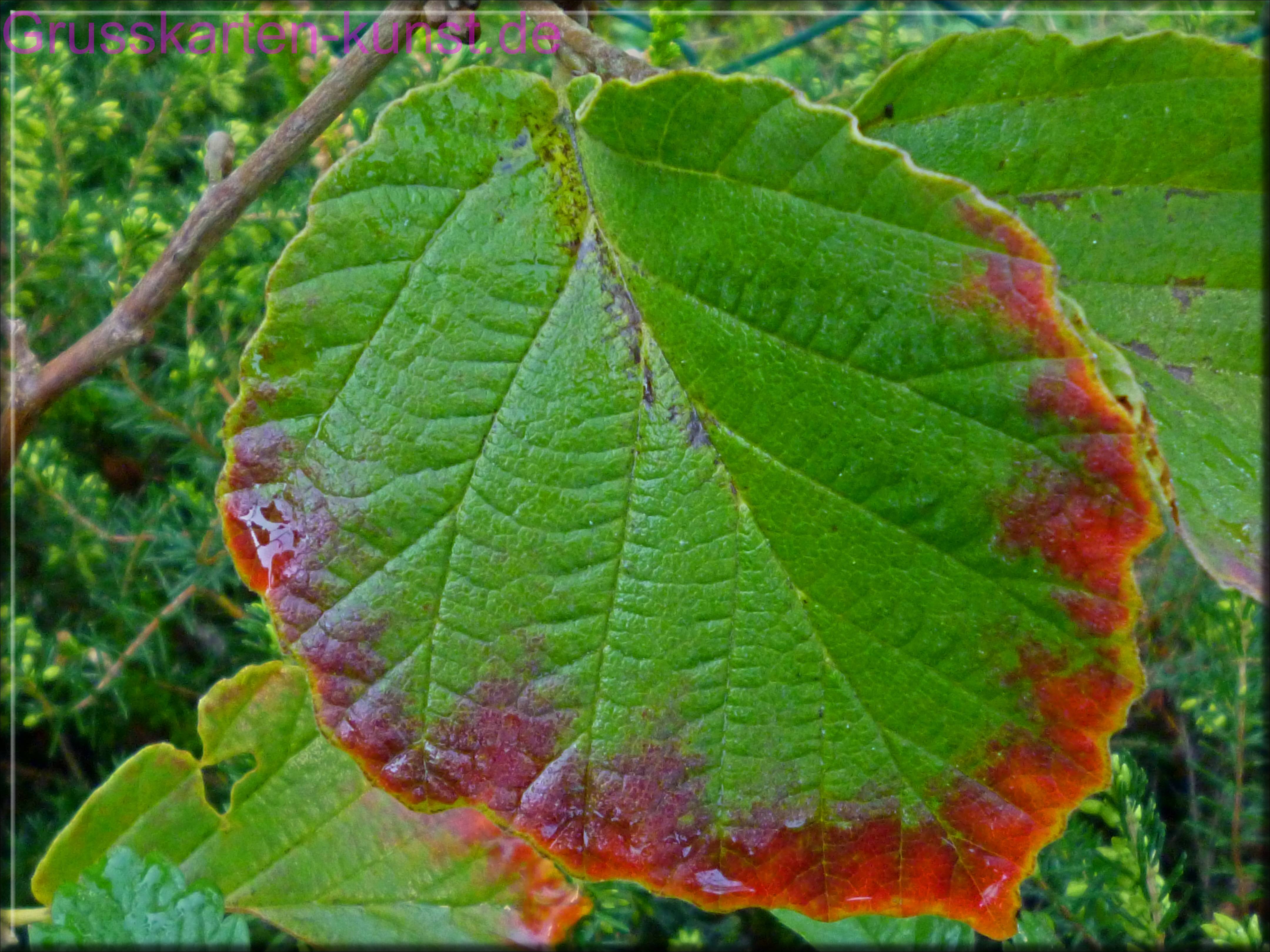 | T35 Die Zaubernuss ist ein Strauch, ähnlich der Haselnuss. Die Blätter haben eine ähnliche, fast herzförmige Form. Die herbstliche Färbung der Zaubernussblätter ist hingegen besonders schön. Das grüne Blatt beginnt sich an den Rändern rot zu färben und es verläuft nach innen hin zu Gelb. Das hier im Frühtau festgehaltene Blatt ist innen noch satt grün. Großaufnahme eines Blattes an dessen Spitze sich das Tauwasser sammelt. Mail mit der Karte T35 versenden Karte T35 vergrößern | |