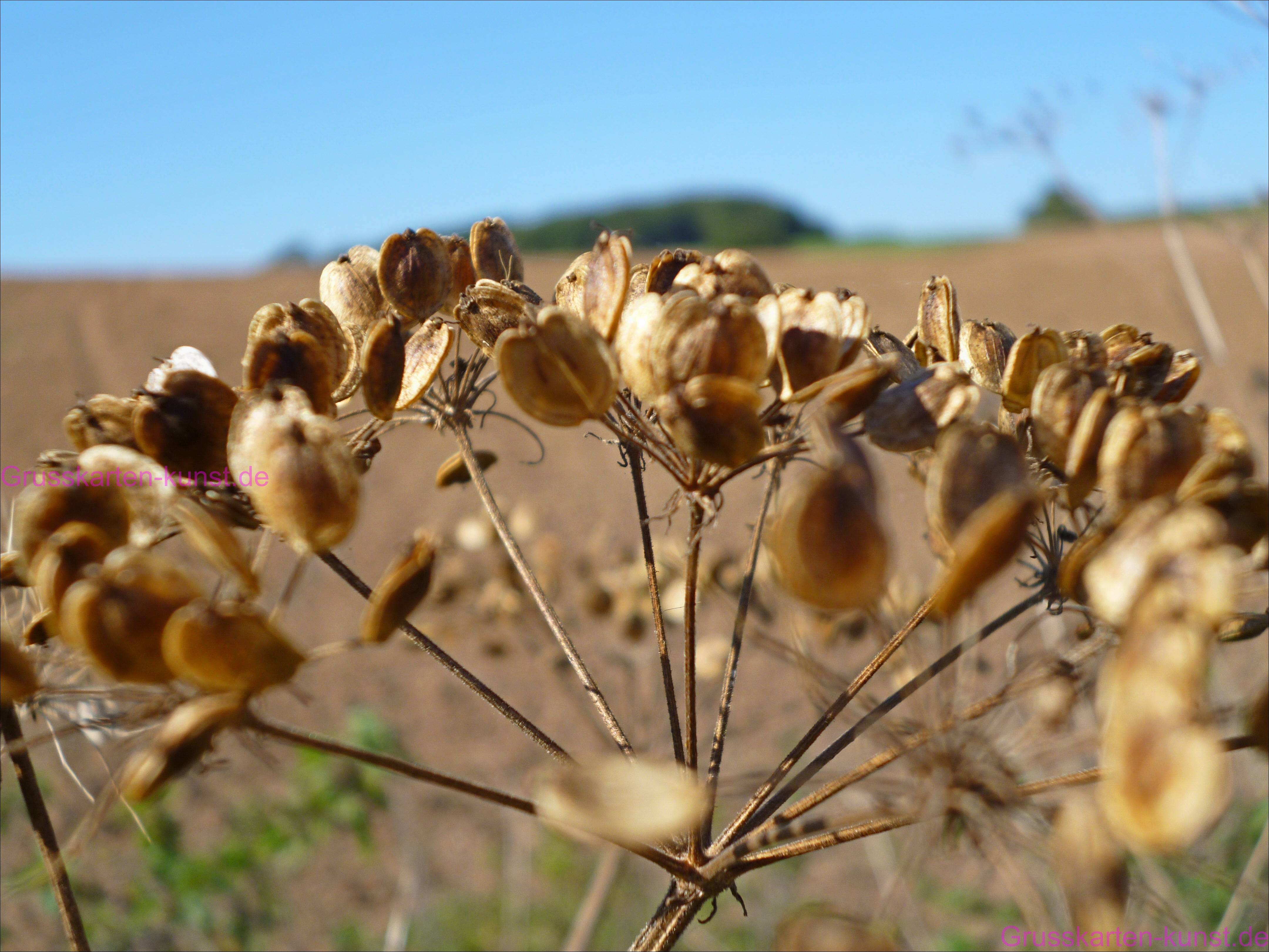 | T36 Während sich im Hintergrund Himmel und Stoppelfeld leicht unscharf die Hände reichen, explodiert im Vordergrund bestechend scharf der trockene beige- braune Blütenrest der Schafgarbe. Die im Hochsommen weißen Blüten an zahllosen Stengelchen sind hier vertrocknet und geben den flachen, rundlichen Samen frei. Wie ein Fächer zentrieren sich die Stengelchen in der Mitte zum Hauptstengel, sodass die Trockenblume wie ein Fallschirm aussieht. Weiche Farben in weichem Licht. Mail mit der Karte T36 versenden Karte T36 vergrößern | |