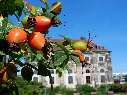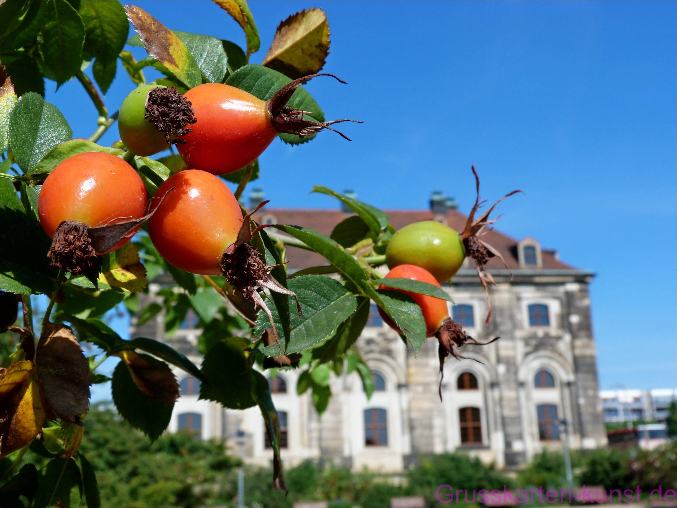 | T37 Nah und fern, rot und blau. Diese Kontraste bietet dieser herbstliche Anblick einer Hagebuttendolde im Vordergrund. Blattgrün und grüne bis orangefarbene Hagebutten leuchten vor einem wahnsinnsblauen Himmel. Im Hintergrund beeindruckt leicht unscharf ein Gebäude aus der Zeit der Renaissance. Knackig Mail mit der Karte T37 versenden Karte T37 vergrößern | |