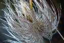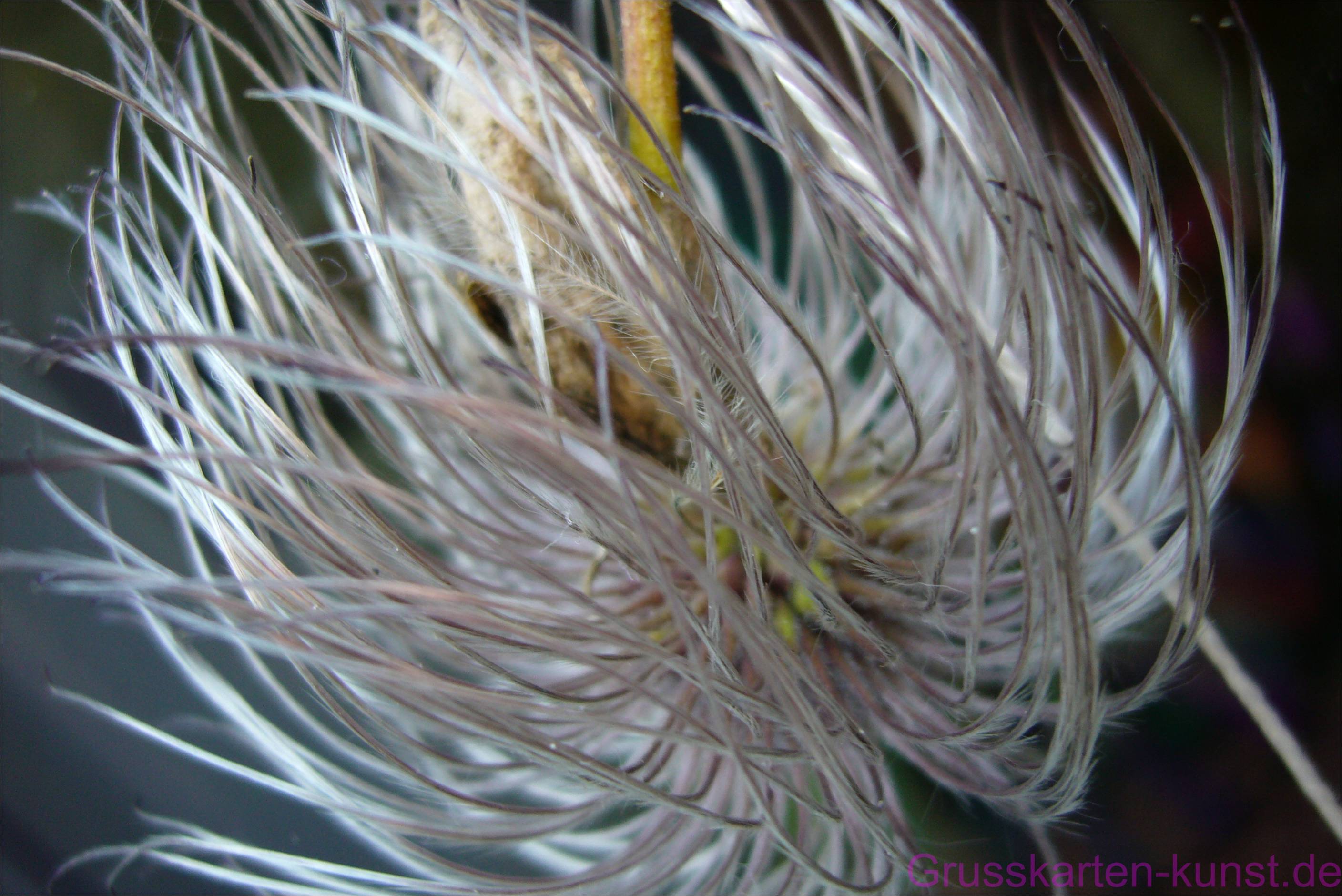 | T38 Nahaufnahme einer etwa wallnussgroßen, haarigen Frucht der Clematis Tangutica. Diese blüht im August gelb und entwickelt dann aus der Blüte diese zarten, flauschigen Haare, an deren Enden sich, ähnlich dem Löwenzahnschirmchen, die Samen befinden. Die silbrig graue Karte mit den diagonal nach oben strebenden, fast tropfenförmigen Fäden, machen neugierig. Mail mit der Karte T38 versenden Karte T38 vergrößern | |