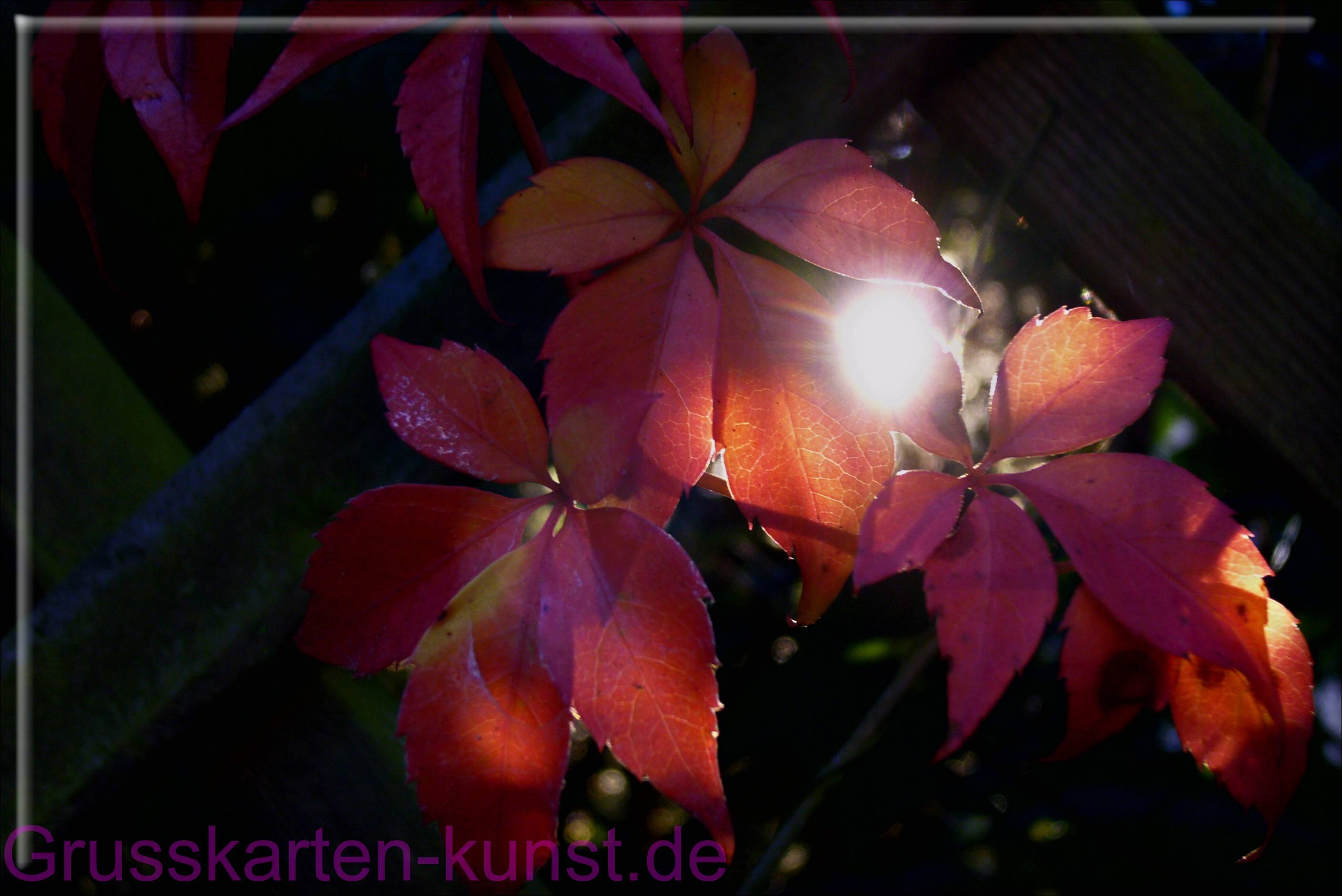 | T39 Glückstreffer. Der wilde Wein, schon rot und gelb gefärbt, wurde hier von hinten von der tiefstehenden Sonne angestrahlt. Wärend ich auf den Auslöser drückte, schob ein Windhauch die zarten Blätter beiseite und die Sonne blitzte durch das Blätterwerk. Kitsch oder Kunst? egal! Mail mit der Karte T39 versenden Karte T39 vergrößern | |