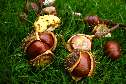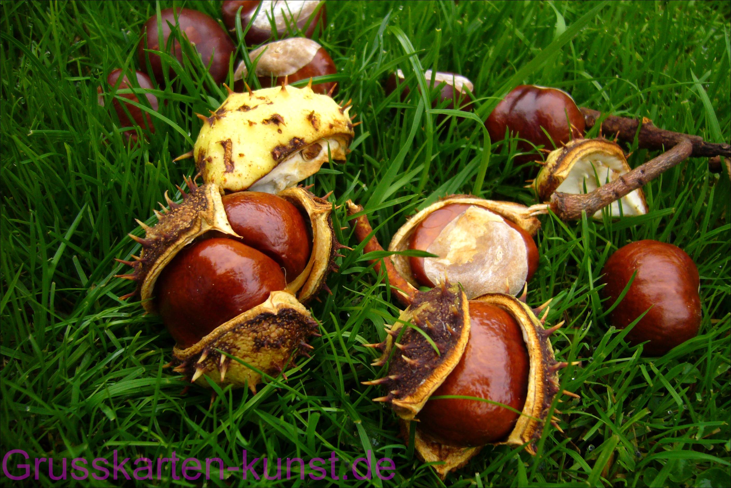 | T40 Auf einer saftig feuchten Wiese liegen einige braunglänzende Kastanien, teils einzeln, teils in aufgeplatzter, stacheliger Schale und sogar ein "Zwilling" . Ja, es ist Herbst. Eine schöne Zeit! Mail mit der Karte T40 versenden Karte T40 vergrößern | |