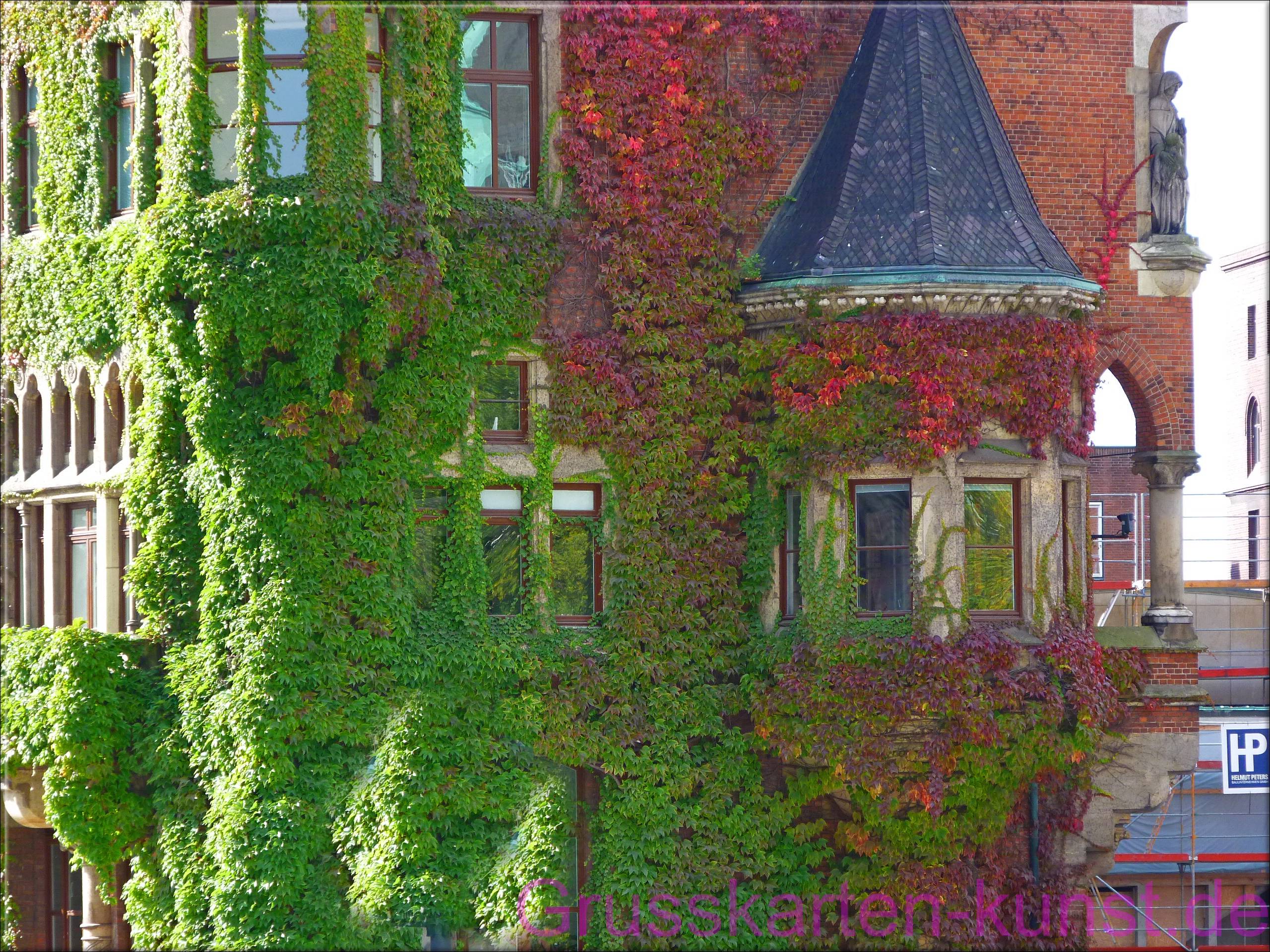 | T41 Ein herrschaftliches Gebäude inmitten der Hamburger Altstadt ist über und über mit bunt werdendem wilden Wein bewachsen. Lediglich die Fenster, in denen sich das Laub und der sonnige Himmel spiegelt, sind von der barocken Fassade zu sehen. Ein Runderker mit kegelförmigem Schieferdach und etwas Back- und Sandstein lassen prächtiges Wohnen in der Nähe des Fleetschlösschens erahnen. Moin moin, Herbst! Mail mit der Karte T41 versenden Karte T41 vergrößern | |