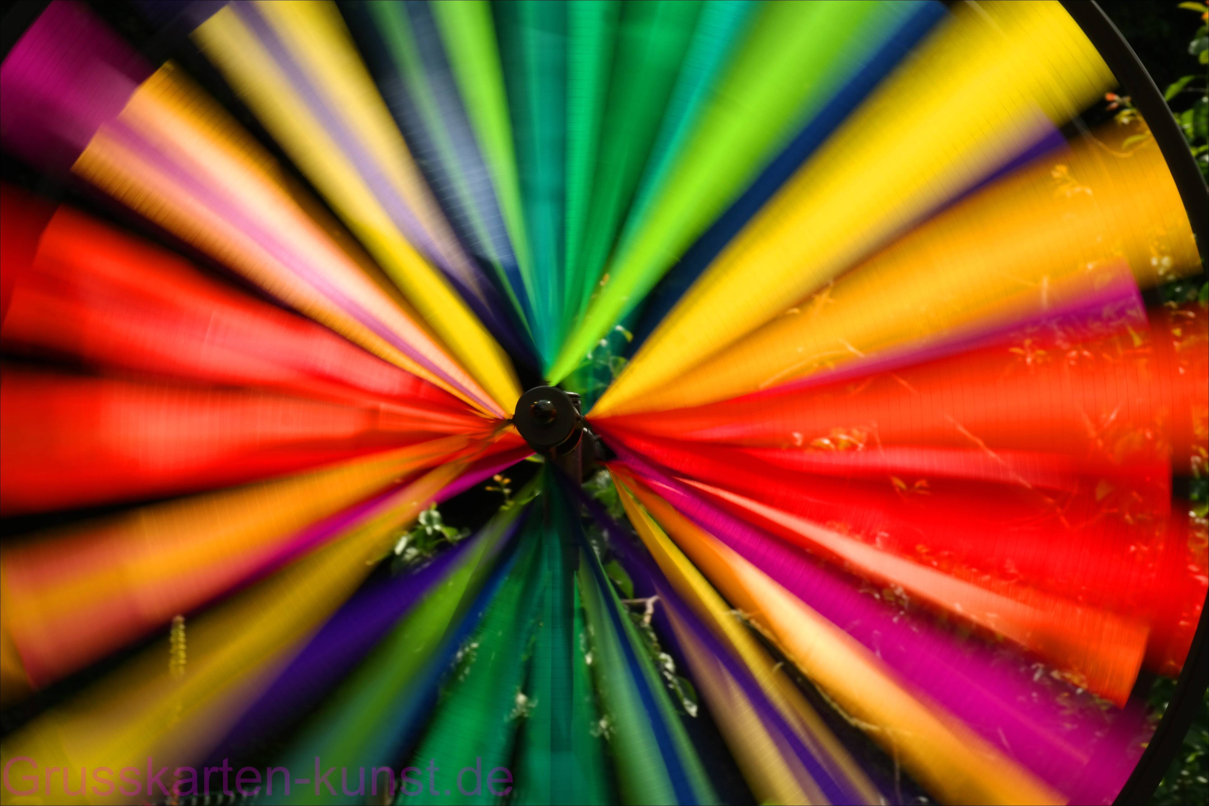 | T42 Regenbogenfarbenes Windrad dreht sich vor dunkelgrünem Hintergrund. Durch die längere Belichtungszeit verwischen die Farben miteinander, was einen bewegenden Effekt hat. Dynamisch Mail mit der Karte T42 versenden Karte T42 vergrößern | |