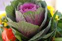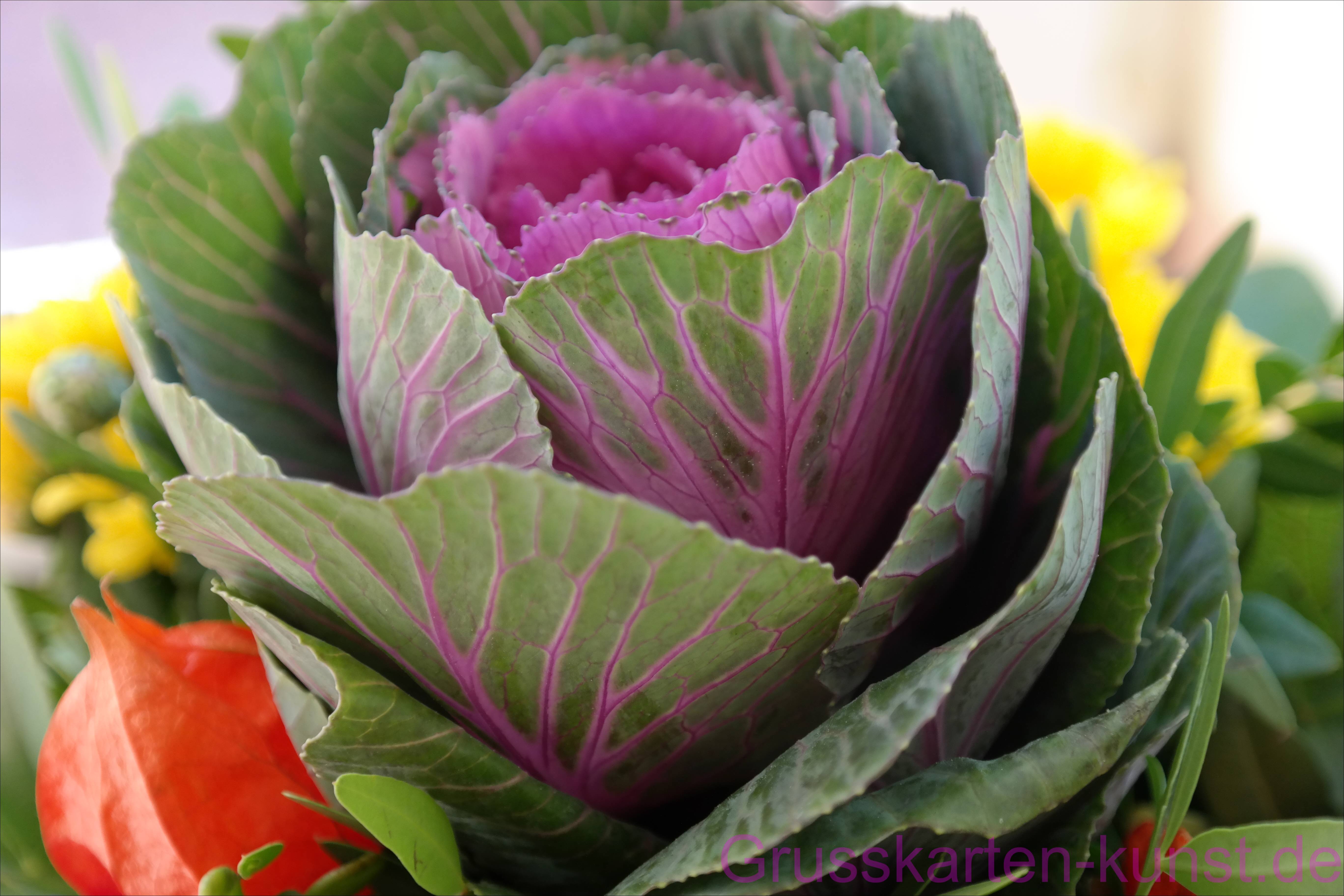 | T43 Ein grünes Kohlgewächs bildet den Mittelpunkt dieser Kartenansicht. In der warmen Luft entblättern sich die sonst eng anliegenden Kohlblätter und aus der Mitte öffnet sich eine Art Blüte. Diese inneren Kohlblätter haben hier eine lila Farbe, ebenso wie die feinen Äderchen in den grünen Kohlblättern. Eine ansich schon tolle Farbkombination außen eingerahmt durch ein wenig unscharfes Gelb und Organge der anderen Blumenstraußblüten. Herbst ist schön. Mail mit der Karte T43 versenden Karte T43 vergrößern | |