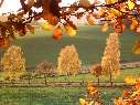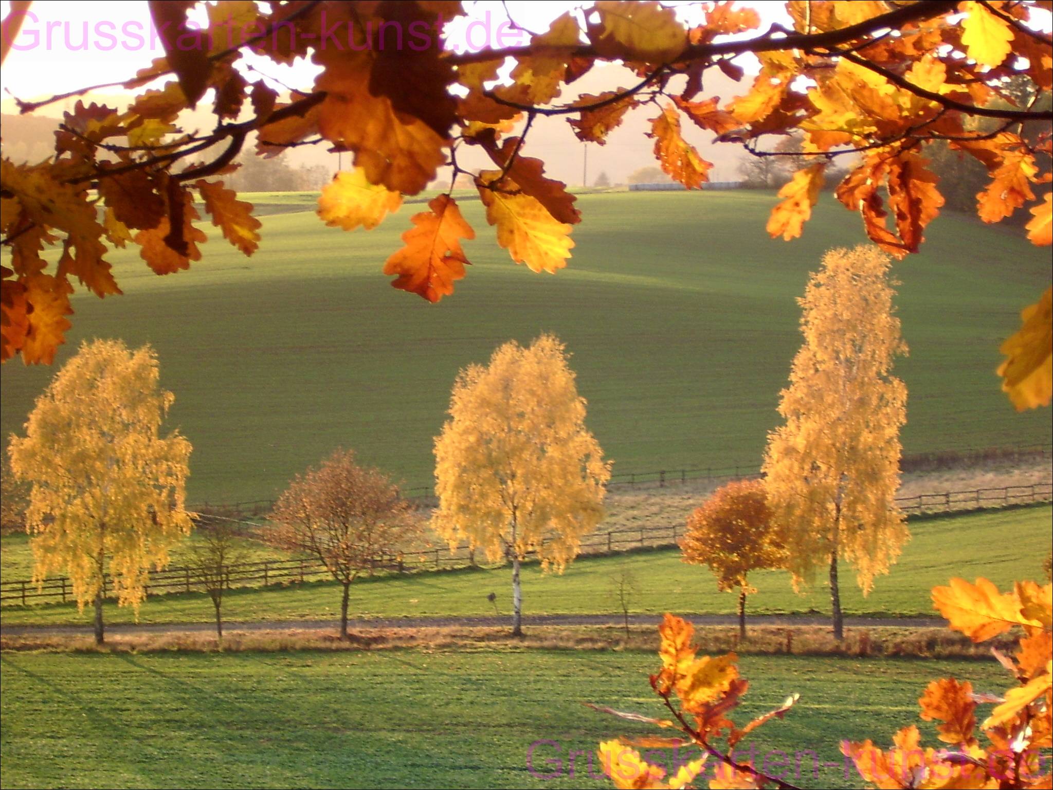 | T44 So wünscht man sich den goldenen Oktober? Von einer leichten Anhöhe fotografierte ich einen von links nach rechts verlaufeden Weg in einem Tal. Der Weg liegt zwischen grünen Feldern. Gegenüber erhebt sich ein weiterer grüner Hügel. Der Horizont wird von einem im Vordergrund von links nach rechts ragenden Ast mit goldgelbem Eichenlaub verdeckt. Die sehr tief stehende, von links gegenüber scheinende Sonne beleuchtet wunderbar das gelb-braune Laub der Bäume und wirft interessante Schatten auf die Felder. Im Zentrum der Karte stehen am Wegesrand entlang drei goldgelb leuchtende Birken und dazwischen zwei rot- grüne Ahornbäume. Da passt einfach alles. Ein Traum in gold und grün. Mail mit der Karte T44 versenden Karte T44 vergrößern | |