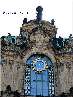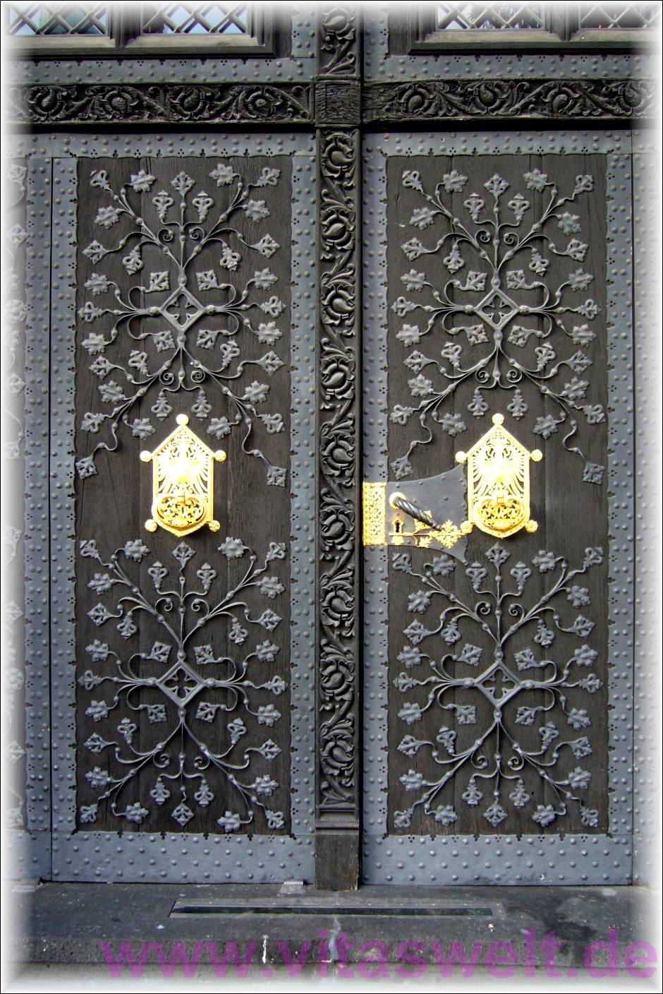 | R01 Eine schwere, schwarze Holz- und Stahltür aus zwei rechteckigen Teilen, die mit vielerlei anthrazitgrauen, verschnörkelten verzierungen versehen ist. Jeder Flügel hat einen eigenen, gold verzierten etwa 30 mal 20 cm großen "Türklopfer", der mittig zu sehen ist. Der rechte Flügel hat einen goldfarbenen Griff. Macht einen starken, edlen, herrschaftlichen Eindruck. Mail mit der Karte R01 versenden Karte R01 bestellen Karte R01 vergrößern | |
