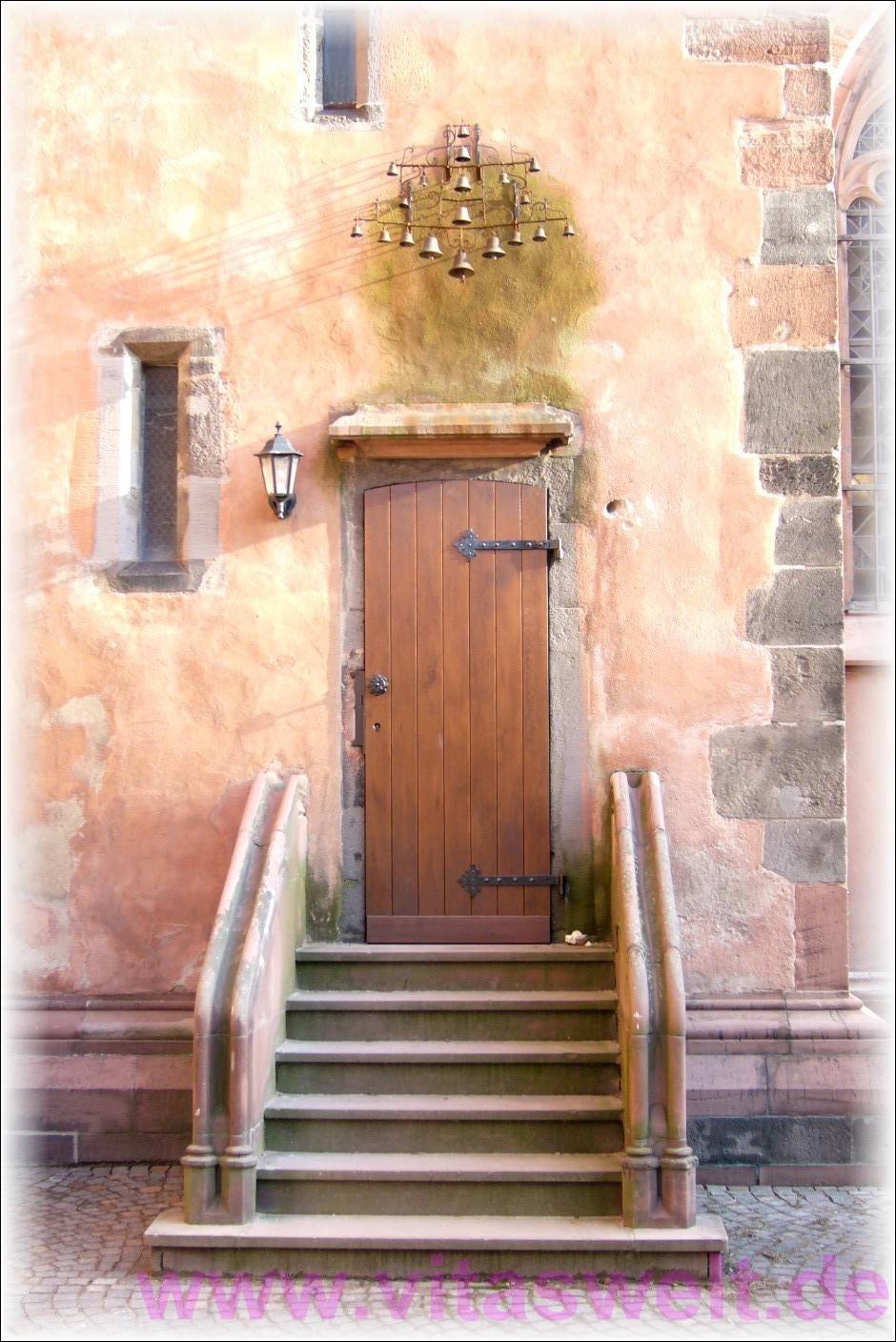 | R02** 6 Sandsteinstufen mit Sandsteingeländer worin sich eine Ablaufrinne befindet, führen zu einer mit Eisen beschlagenen, Nussbraunen Holzflügeltür. Über dieser Tür hängen, wie bei einem Mobile, etwa 20 verschieden große Messingglöckchen. Die von rechts scheinende Sonne, wirft zierlich leichte Schatten an die mit Sandputz verkleidete Wand. Links und oberhalb der Tür befinden sich zwei mit Sandstein eingefasste schmale, hohe Fensterchen. Am Rechten Rand sieht man in vertikaler Richtung das Sandsteingemäuer. Eine kleine, weiße und gusseiserne Laterne direkt linksseitig der Tür und ein kleiner gemauerter Vorsprung über der Tür komplettieren die Ansicht. Südländisches Flair bei tollem Licht. Rätsel: Wer weiß, wo es ist ? Mail mit der Karte R02 versenden Karte R02 bestellen Karte R02 vergrößern | |