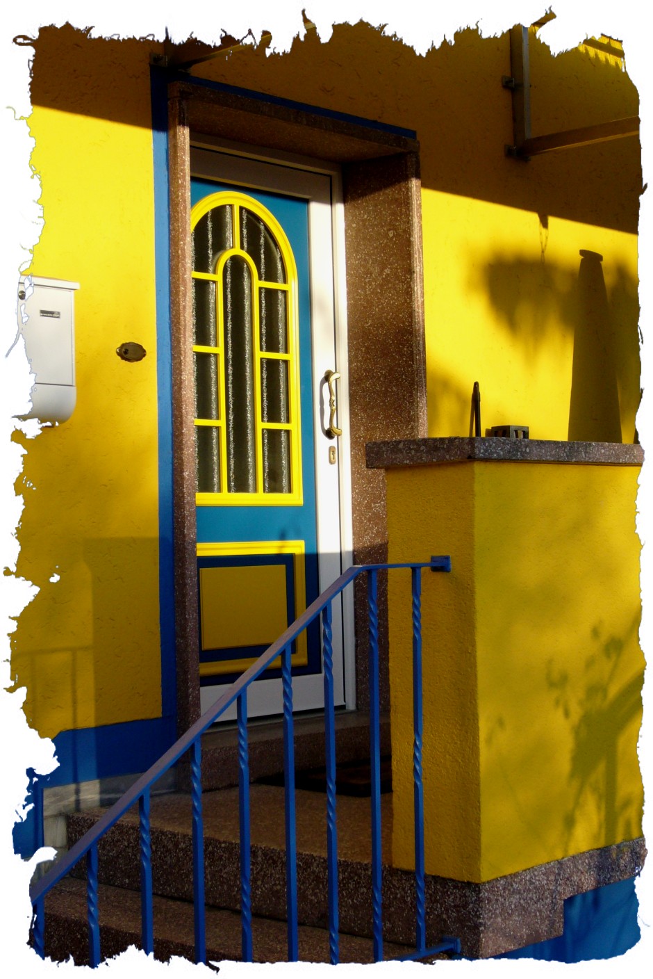 | R06 Eine weiß-gelb-grün und blau gestrichene Tür mit einem Glaseinsatz als Rundbogen schmückt dieses Haus. Die Schräge Ansicht zeigt den Treppenaufgang mit einem kornblumenblauen Geländer und das Podest mit einer gemauerten Brüstung. Diese ist wie das Haus in dunklem Zitronengelb gestrichen. Die tiefstehende Sonne wirft interessante Schatten. So erahnt man einen Rosenbogen mit Blütenresten. Der Kartenrand ist "ausgefranst" Quitsch frischer Anblick, der Lust auf Sommer macht.... Mail mit der Karte R06 versenden Karte R06 bestellen Karte R06 vergrößern | |