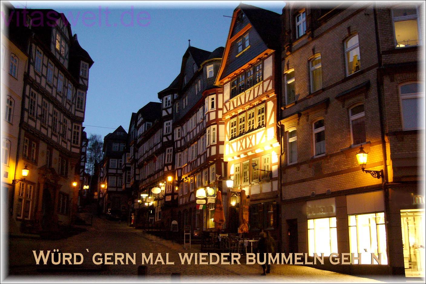 | R07 "Würd`gern mal wieder bummeln geh`n" steht am unteren Rand der Karte, die eine ansteigende, geflasterte und von Fachwerkhäusern gesäumte Straße vor einem im Zwielicht getauchten, blauen Himmel zeigt. Die Resthelligkeit paart sich mit den Straßenlaternen, Fensterbeleuchtungen und beleuchteten Reklameschildern. Ein im Vordergrund stehendes, rotes Fachwerkhaus wird von unten mit Strahlern beleuchtet, so dass der Giebelüberstand über der Schieferverkleidung eine deutlich rötliche Kontur zeigt. Eine einladend, gemütliche Atmosphäre zumal auch Außenbestuhlung, auf dem terassenförmigen Anstieg, zum Verweilen einläd. Wo es ist ? Im wunderschönen Marburg. Mail mit der Karte R07 versenden Karte R07 bestellen Karte R07 vergrößern | |