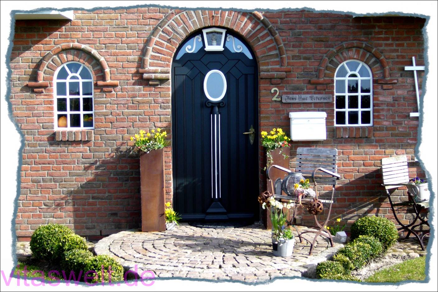 | R09 Sie schauen auf eine typisch norddeutsch geklinkerte Hausfassade mir rötlichem Klinker. Die dunkle Tür hat einen Rundbogen mit Oberlichtfenstern und einen ovalen Glaseinsatz in dem sich der blaue Himmel spiegelt. Auf beiden Seiten befinden sich weiße Sprossenfenster, ebenso oben halbrund. Tür und Fenster sind auch halbrund verklinkert. Das runde Eingangspodest ist aus hellem Flasterstein und beidseitig von immergrünen kleinen Sträuchern umsäumt. Links und rechts der Tür stehen zwei hohe, teracottafarbene Pflanzkübel mit gelben Narzissen. Auch steht ein Stuhl rechts vor dem Eingang auf dem eine Planzschale steht. Ein einladender, gemütlicher und liebevoll gestalteter Eingang im Sonnenschein. "Komm doch mal wieder rein - oder komm mal raus...." Mail mit der Karte R09 versenden Karte R09 bestellen Karte R09 vergrößern | |