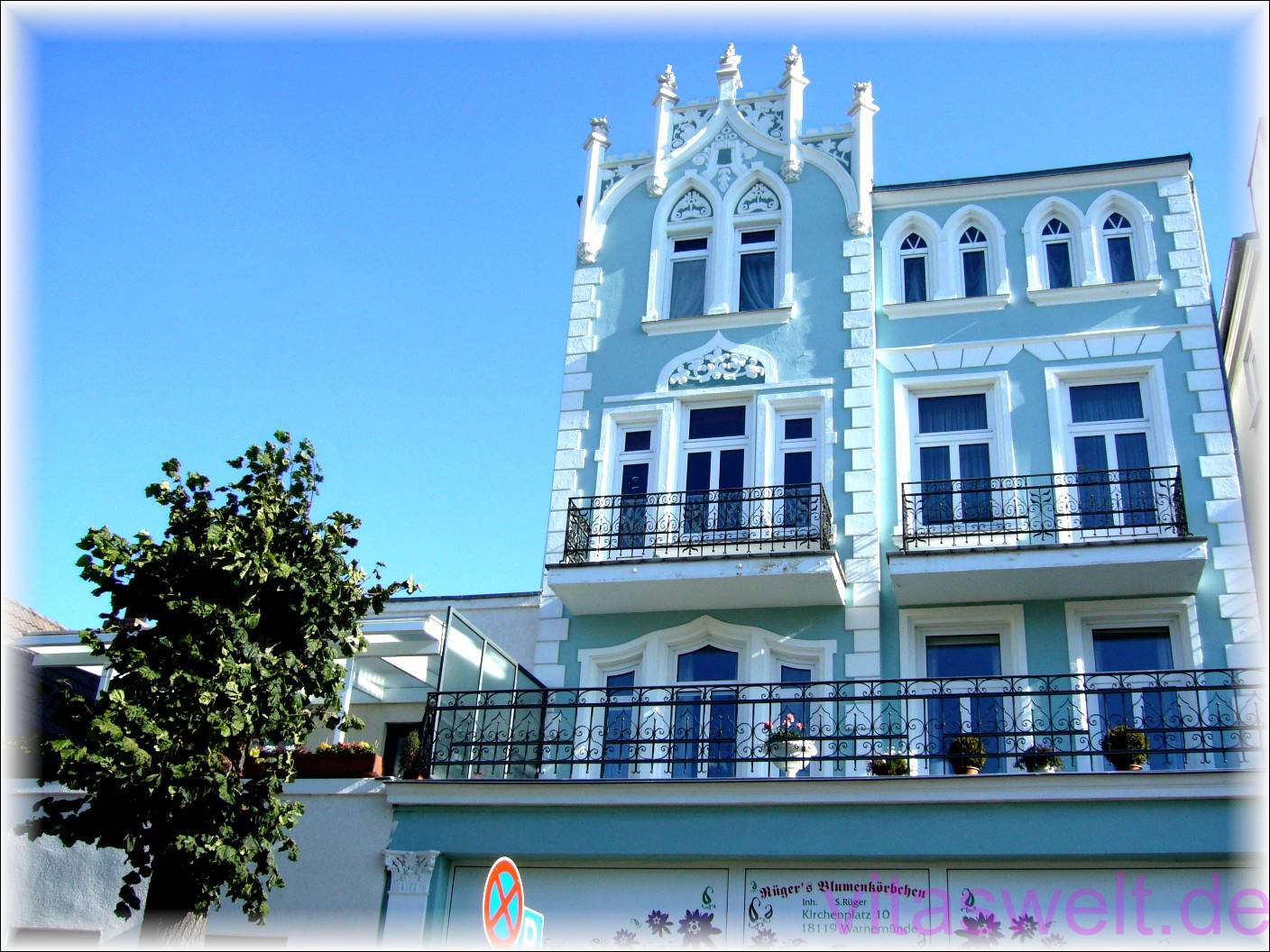| R10 Vor einem leuchtend- blauen Himmel ragt dieses schöne, herrschaftliche Haus in die Höhe. Es hat hellblauen Putz und weite Fenster, die zusätzlich außen herum im Putz weiß abgesetzt sind. Alle drei Stockwerke haben bodentiefe Fenstertüren und die unteren Stockwerke Balkon und Terasse. In der linken Bildhälfte ragt ein belaubter Baum in den Himmel, was die Ansicht "belüftet". Die linke Haushälfte hat an der Giebelseite 5 aufstrebende Säulen in Weiß. Die Perspektive richtet sich schräg nach oben, so wirkt die Aufnahme flüchtig. Unten erkennt man noch einen Schriftzug "Blumenkörbchen-Kirchplatz10" Aufgenommen in Warnemünde. Der Blick aus dem Haus muss herrlich sein. Überhaupt ein schöner Ort. Mail mit der Karte R10 versenden Karte R10 bestellen Karte R10 vergrößern | |