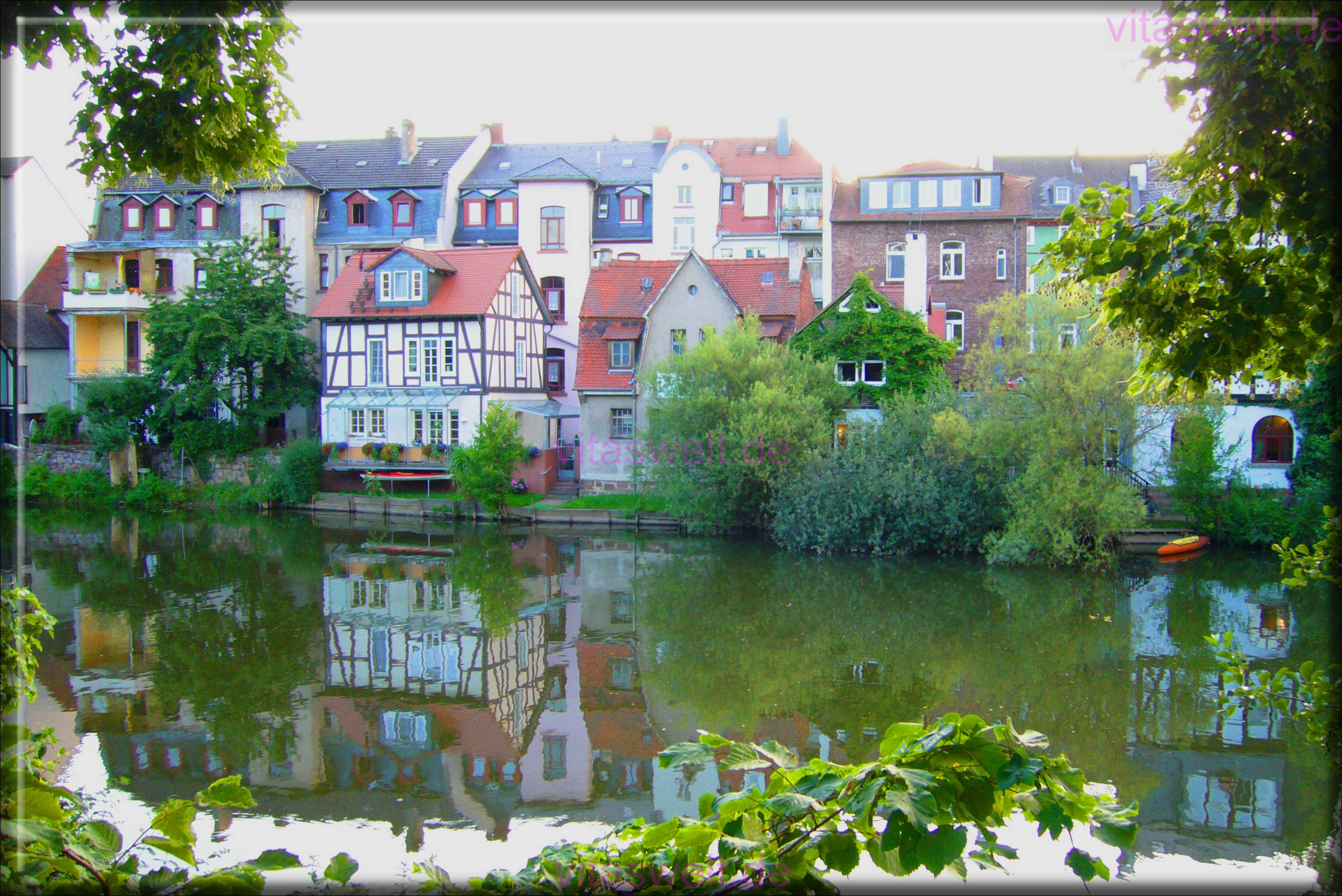 | R11 Idyllisch: Eine bunte und aufwändig restaurierte Häuserzeile am Ufer der Lahn in Marburg. Mittig wird das Bild leicht diagonal von der Uferkante getrennt. Am unteren teil spiegeln sich die Häuser im ruhigen Fluss. Einige der unterschiedlich schmalen und hohen Altstadthäuser verschiedener Baustile, sind teilweise von grün belaubten Büschen und Bäumen verdeckt. Das Ufer ist mit etwa 4 Metern schmal und meist mit Gras bewachsen oder es sind kleine Gärten mit Terrasse zu sehen. Am rechten Ufer Rand liegt ein Kanu im Wasser und eine Lampe spiegelt sich durch einen Fensterbogen im Wasser. Die unterschiedlich farbigen Häuser, Dächer, Fensterläden und Balkone machen das Bild zu einem detailreichen Genuss. Ein wenig eingerahmt wird diese stille Atmosphäre von Laub auf der Fotografenseite. Mail mit der Karte R11 versenden Karte R11 bestellen Karte R11 vergrößern | |