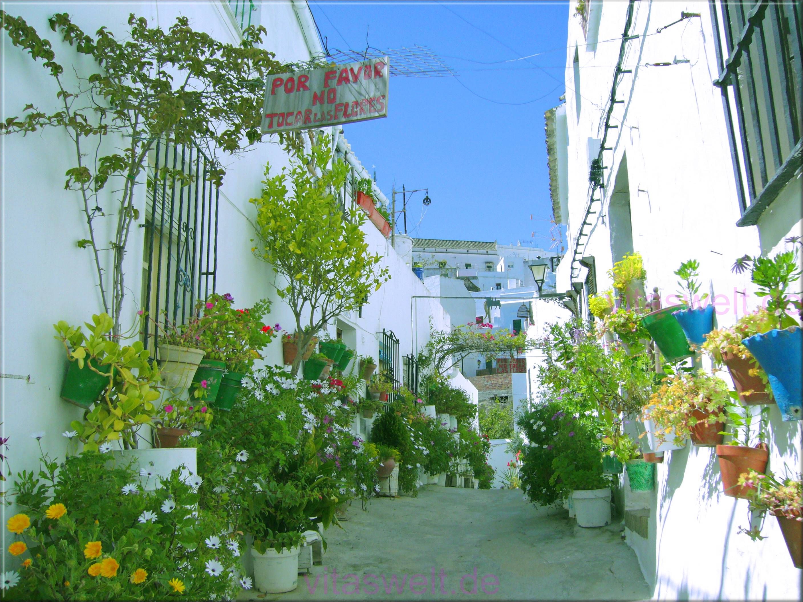R12 Spanien. 30 Grad. Blauer Himmel. Stadtbummel in einem Hügeldorf mit weißen Häusern. Schiefe, verwinkelte Gassen. Neue Gerüche. Leichter Wind. Plötzlich ein Weg zu Ende. Oder doch nicht ? Einige Stufen hoch. Blick in eine ansteigende Gasse mit beidseitig weiß getünchten Häusern. Der Fußboden, die Wände, die Balkone, die Stufen und alle erdenklichen Vorsprünge sind mit blühenden Blumen in Töpfen geschmückt. Über uns der blaue Himmel und ein zaghaftes, handgeschriebenes Schild: Por Favor: "No Tocor les Fleures". Ein toller Blick, eine schöne Erinnerung. Eine Ahnung und die Gewissheit: Immer wieder kommt ein neuer Sommer. | |