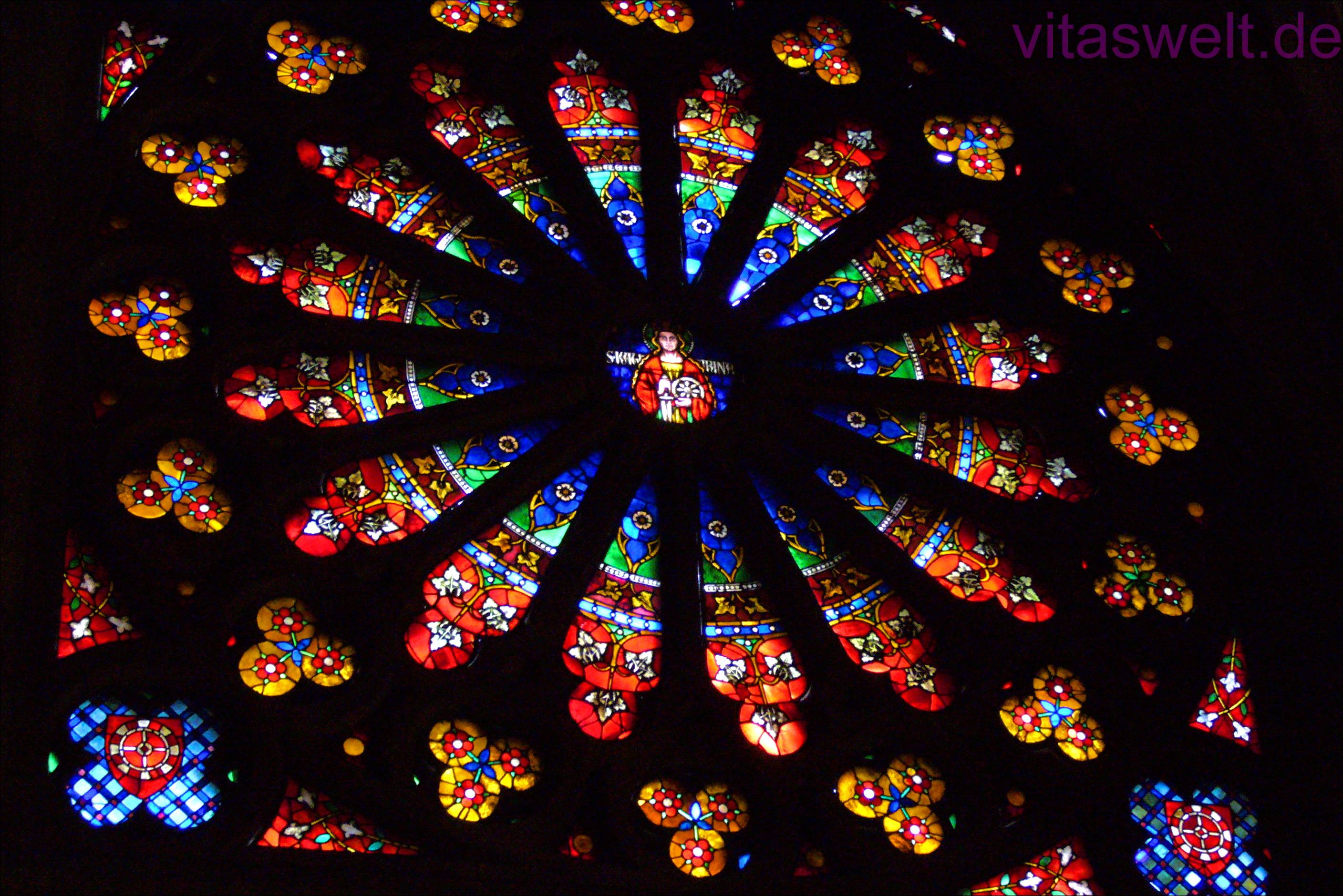 | R15 Das Freiburger Münster hat 80 Fenster in unterschiedlichsten Formen und Größen, die seinen Innenraum erhellen. 20 davon bestehen aus farblosen Butzen- oder Rechteckscheiben. Die übrigen 60 sind mit Glasmalereien versehen. 35 Fenster haben ihre mittelalterliche Farbverglasung. Insgesamt beinhalten diese 35 Fenster noch über 500 alte Scheiben - ein in seiner Fülle wie in seiner künstlerischen Vielfalt überraschend reicher Bestand, der drei Jahrhunderte, vom frühen 13. bis zum frühen 16.Jahrhundert, umfasst fast vollständig bewahrt. Viele Fenster haben ein Thema oder stellen eine Handwerkszunft dar. Das hier abgebildete Fenster beeindruckt durch seine leuchtenden blau, rot, grün und orange Töne, sowie durch seine runde Form. Die bunten Gläser sind wie zwischen die Speichen eines Rades in das Mauerwerk integriert. So ergeben sich 16 nach außen zeigende, längliche Felder, die sich um ein Zentrumsbild zu drehen scheinen. 16 aus drei Kreisen zusammengefügte blumenartige Fenster umrahmen die Dynamik. Vorwiegend sind Wappen abgebildet. Beruhigend und doch spannend. Mail mit der Karte R15 versenden Karte R15 bestellen Karte R15 vergrößern | |