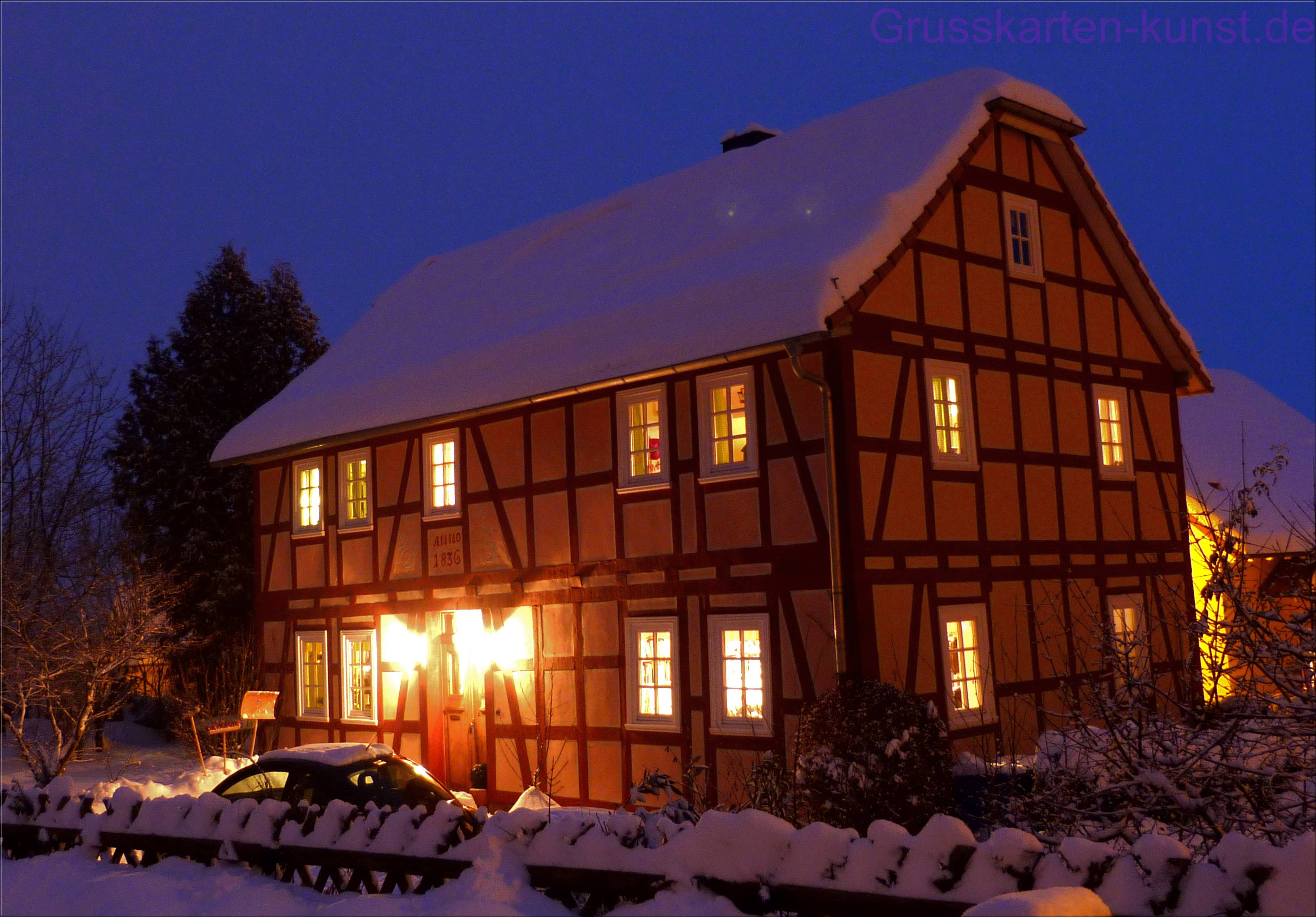 | R16 Wunderschön restauriertes Fachwerkhaus Anno 1836. Ochsenblutrotes Fachwerk und rosafarbenes Gefache. Sämtliche Lichter des zweistöckigen Hauses und die Außenbeleuchtung neben der Tür sind erleuchtet. Das Dach und der Zaun davor sind mit viel Schnee bedeckt und der Himmel wirkt in der Abenddämmerung tief dunkelblau. Giebel und Traufseite sind von einer leicht erhöhten Position diagonal fotografiert. Fast Hexenhausmäßig. Foto: J. Cremer Mail mit der Karte R16 versenden Karte R16 bestellen Karte R16 vergrößern | |