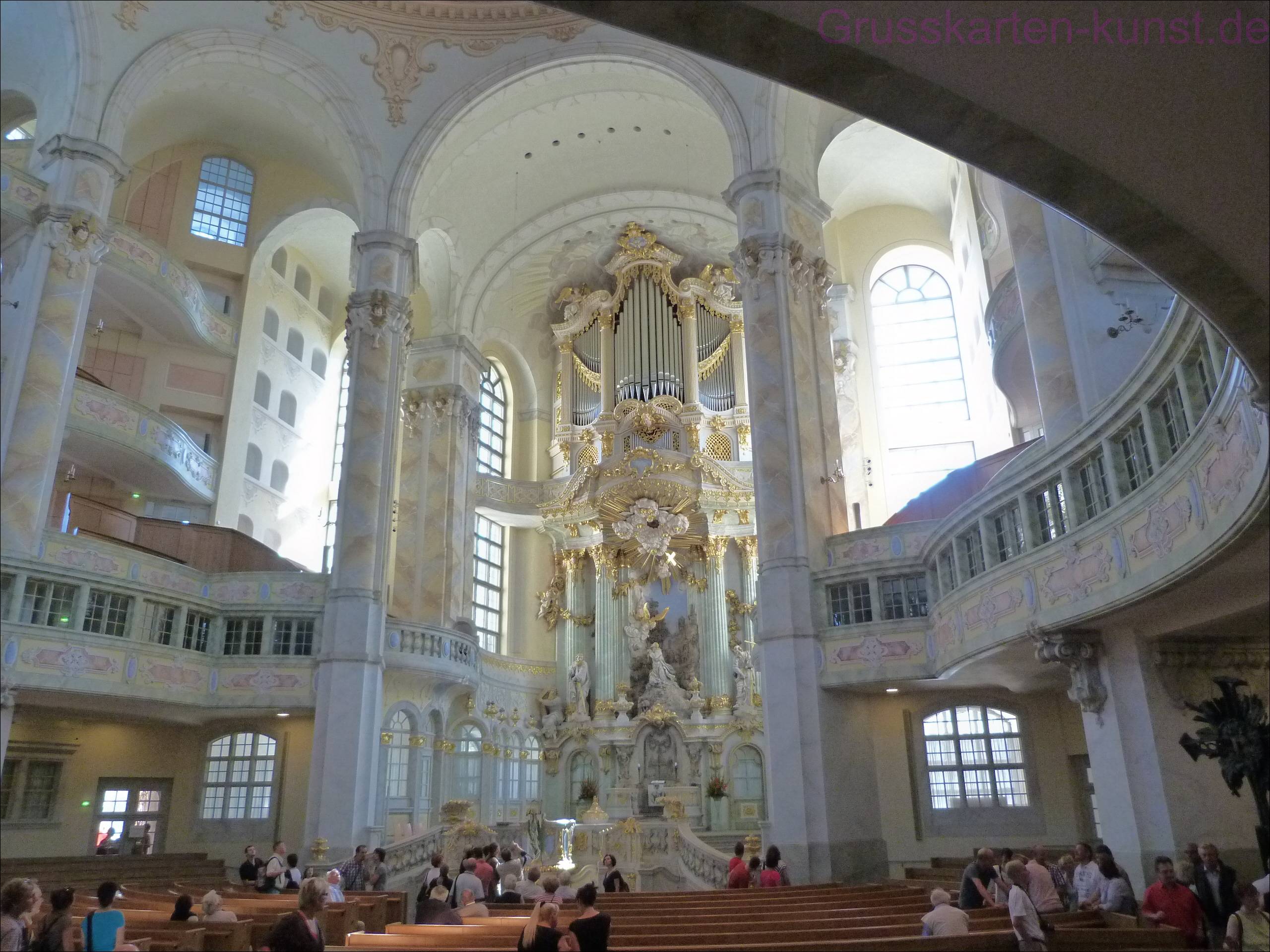 | R19 Hier schauen Sie über den Hauptraum auf das Orgelspiel und den Altar der Dresdener Liebfrauenkirche. Ein unbeschreiblicher Anblick, geprägt von Helligkeit, filigraner Architektur, andächtiger Mächtigkeit. Jeder Versuch einer vollständigen Beschreibung wird kläglich scheitern. Ein Versuch: Stellen Sie sich vor, die betreten ein fast rundes Kirchengebäude. Es riecht nach Sandstein und Holz. Von einem 4-stufigen Podest herab betreten Sie den rundherum hell erleuchteten Innenraum in dem die Sitzbänke stehen. Über ihnen befindet sich die runde Kuppel, die unter R18 beschrieben wurde und eine umlaufende Empore, die nur an der ihnen gegenüberliegenden Seite durch einen riesigen Säulenbogen, hinter dem sich der Altar und die Orgel befinden, unterbrochen ist. Beide sind harmonisch übereinander angebracht und gehen optisch nahezu ineinander über. Von rechts scheint die Sonne durch riesige Sprossenfenster und erleuchtet das bis zur Decke ragende Orgelspiel mit seinen silbernen Pfeifen. Die neue Orgel verfügt über 4876 Pfeifen, 67 Register auf vier Manualen und Pedal und wurde im September 2005 fertig gestellt. Verzierungen und Wandbemalung sind in Pastellfarben gehalten. Fresken und mit Gold verzierte Spielereien komplettieren dieses noch recht neue Schmuckstück. Auch Menschen ohne festen Glauben sind sicherlich beeindruckt. Mail mit der Karte R19 versenden Karte R19 vergrößern | |