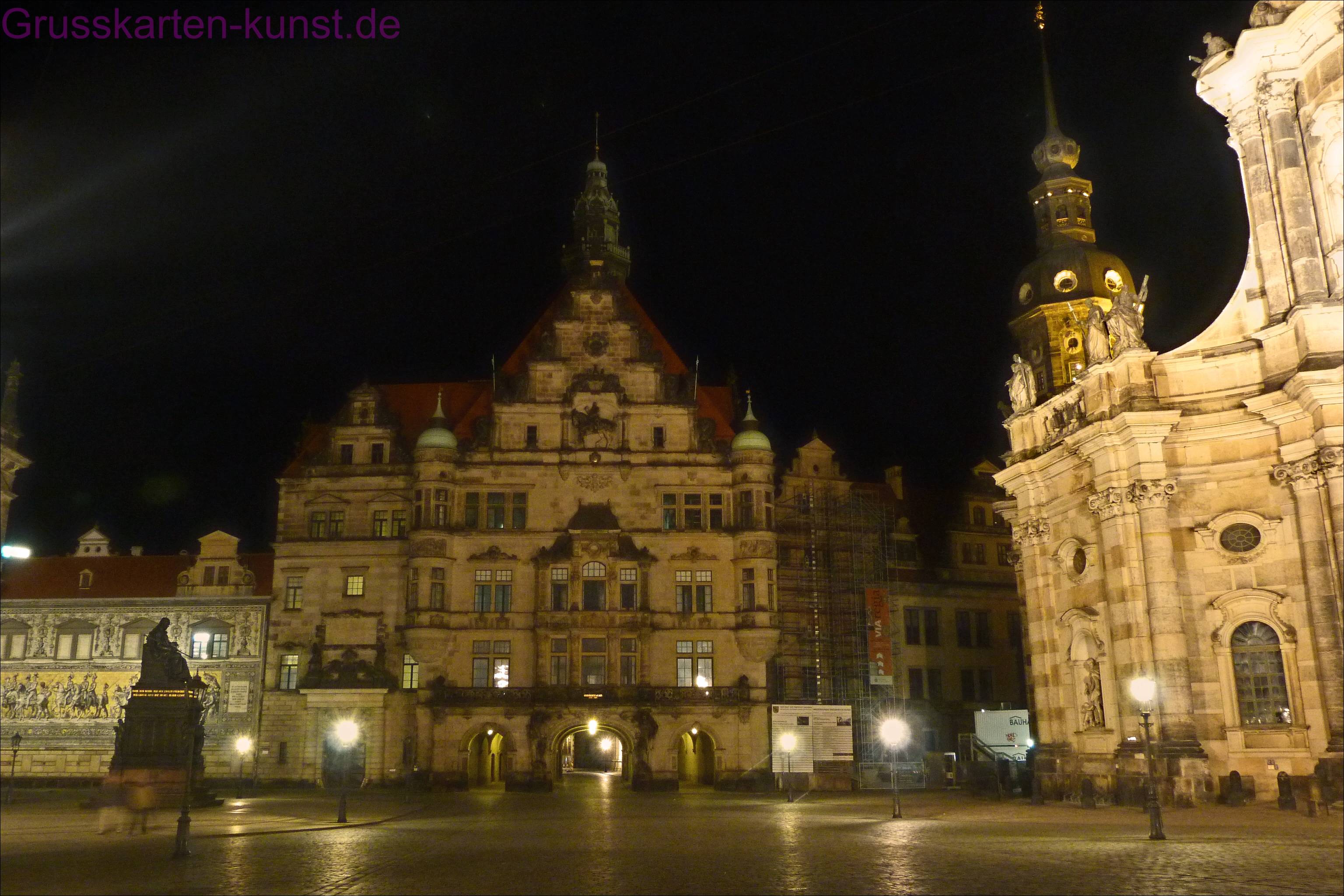 | R21 Nächtliche Stimmung am Georgentor in Dresden. Stellen Sie sich vor sie stehen auf einem gepflasterten Platz, vor Ihnen stimmungsvoll leuchtende, alte Straßenlaternen und ein angestrahltes Gebäude von der Giebelseite aus gesehen. Mehrere beleuchtete Torbögen und Fenster in unterschiedlichen Stockwerken ziehen ihren Blick an. Das rot gedeckte Dach schimmert spitz vor dem nachtschwarzen Himmel. Fast möchte man glauben, das Ganze sei eine gemalte Pappfassade, wenn da nicht rechts und links noch weitere Gebäude den Platz säumen würden. Hat für mich etwas von einem Zaubererschloss. Ist aber „bloß“ das Dresdner Residenzschloss mit dem berühmten grünen Gewölbe. Mail mit der Karte R21 versenden Karte R21 vergrößern | |