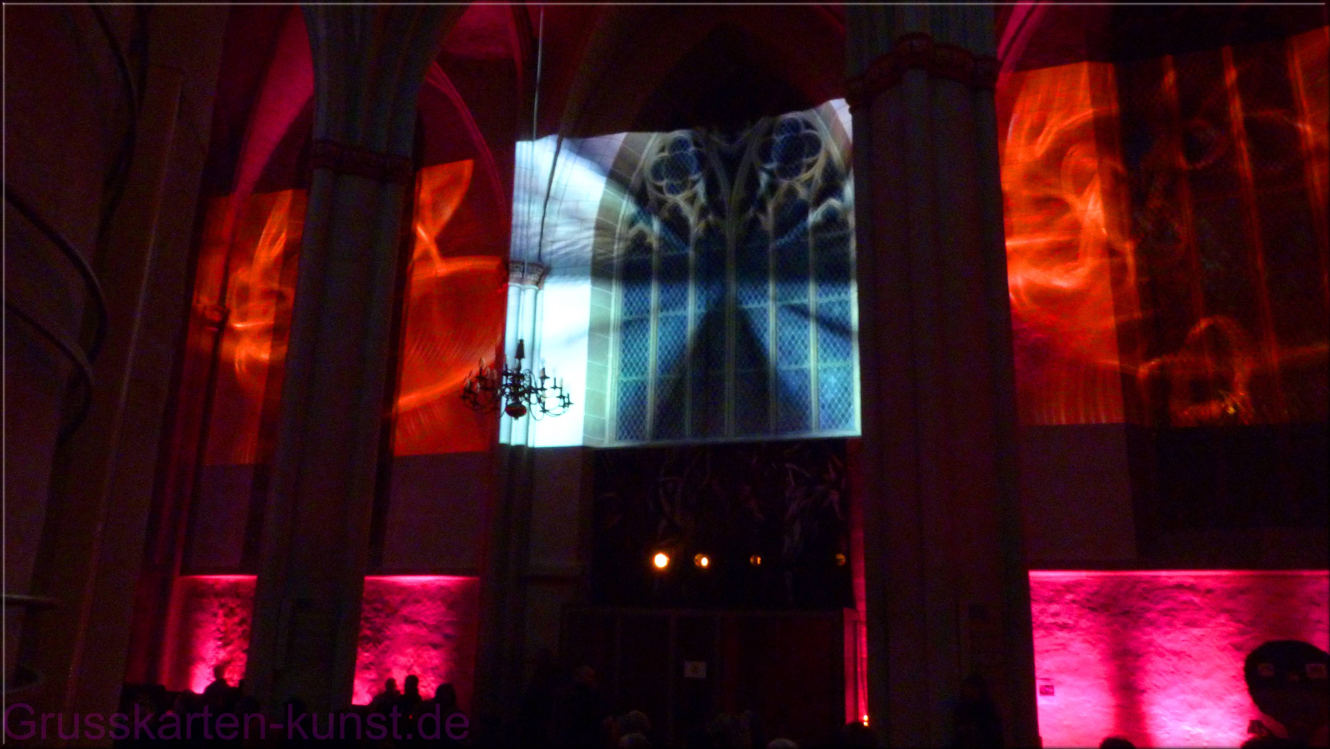| R22 Das Innenschiff der Lutherischen Pfarrkirche in Marburg wurde mit Lichtinszenierungen beleuchtet. Hier sieht man mittig ein gotisches Fenster, angestrahlt von blaugetönten Spiralformen. Links und rechts davon erstrahlen an den Wänden dunkelrot, kreisförmige Muster. Links und rechts unten leuchten violette Farben an den Wänden. Bizarr, warm, aufregend, eben anders. Mail mit der Karte R22 versenden Karte R22 vergrößern | |