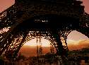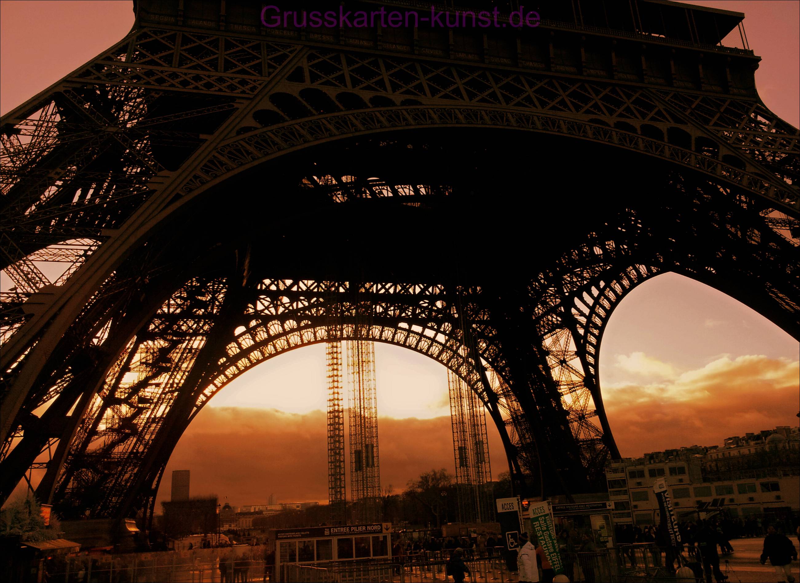 | R24 Fuß des Pariser Eifelturms im Gegenlicht der kupferfarbenen, untergehenden Sonne. Wie eine 4-beinige Krake steht dieses imposante Bauwerk halb über dem Betrachter. Seine Füße aus unzähligen diagonalen, waagrechten und senkrechten Streben in unterschiedlichen Stärken sieht man im gegenlicht nur silhouettenartig. Durch die Torbögen hindurch leuchtet der Himmel, ein Kran steht in der Ferne und einige Hausdächer der Stadt sind im Zwielicht zu erkennen. Die Turmspitze ist "abgeschnitten". Man hat den Eindruck man steht wenige Meter neben dem 1887 erbauten Eisenfachwerk mit 324m Gesamthöhe und schaut nach oben. Küssen erlaubt! Mail mit der Karte R24 versenden Karte R24 vergrößern | |