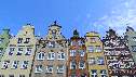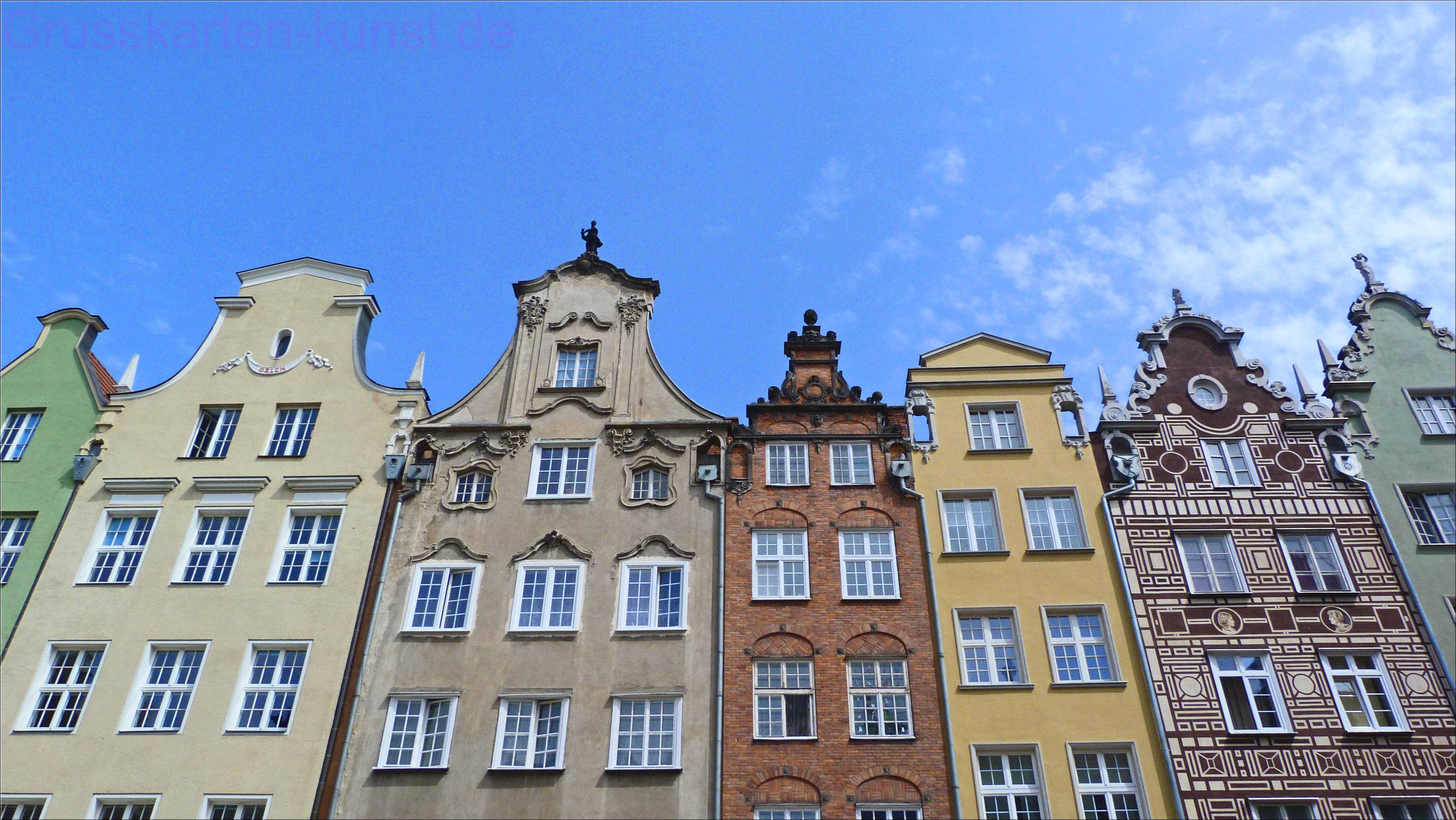 | R25 Häuserzeile der Danziger Altstadt in den blauen Himmel hinein fotografiert. 7 schmucke Häuser aus Klinker, Putz, Kratzputz und im Fachwerkstil bemalt ragen vor dem Betrachter in den Himmel. Alle haben einen anderen, pastellfarbenen Farbton, von lindgrün über teracotta, buttergelb bis beige und einen anders geschwungenen und verzierten Giebel. teilweise sind die Häuser 2-3 Meter schmal, haben nur 2 oder 3 nebeneinander liegende weiße Sprossenfenster. Die Stadt ist so reichhaltig an derartig herrschaftlichen Häusern, dass eine Auswahl schwer fällt und sicher noch ein weiteres Motiv hinzu kommt. Mail mit der Karte R25 versenden Karte R 25 vergrößern | |