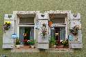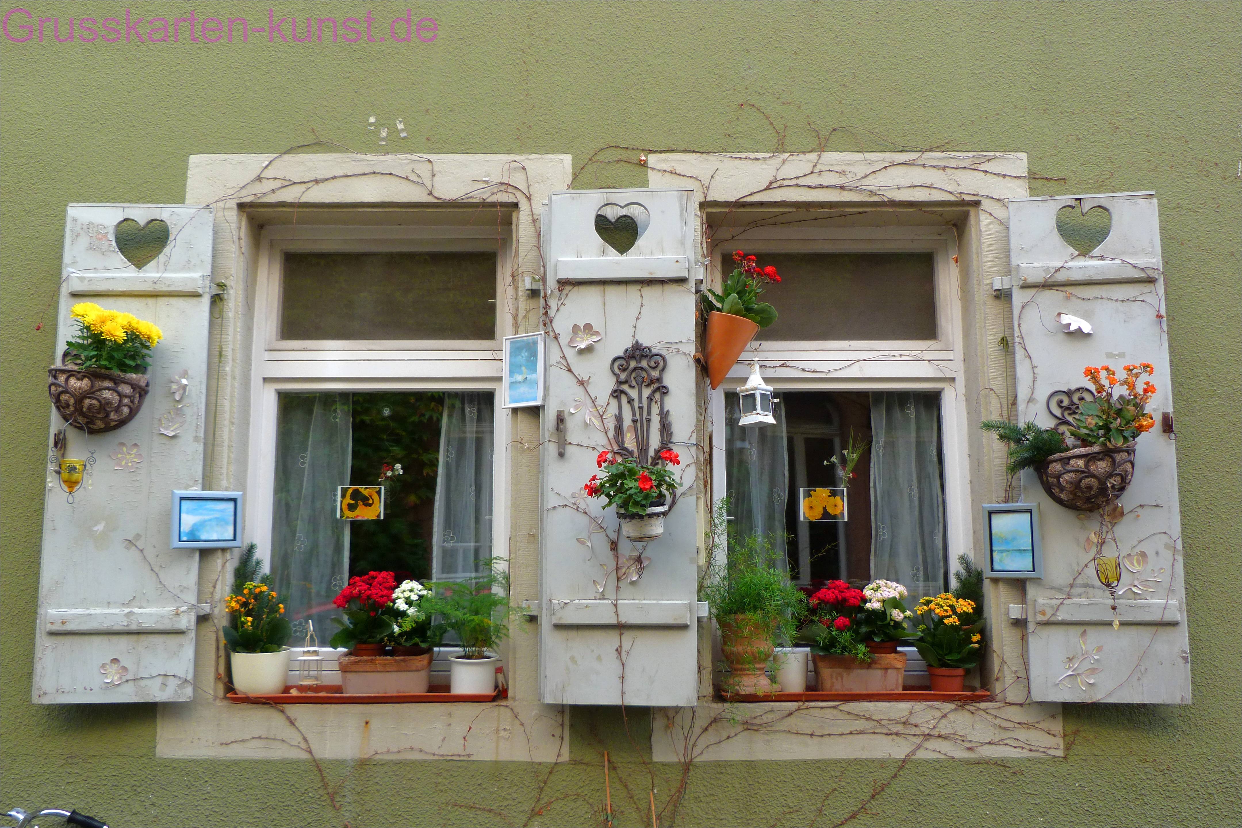 | R27 Sie Schauen auf zwei Fenster mit graubraunen Klappfensterläden zu jeder Seite. Diese haben am oberen Rand aus dem Holz ausgeschnittene Herzen und an der zur Straße hin geöffneten Seite jeweils bunte Blumen in Hängetöpfen. Auf den Fensterbänken stehen jeweils 3 bunte Blumentöpfe, in den Fenstern hängen leichte, weiße Stickgardinen sowie hängende Fensterdekorationen. Das ganze wirkt liebevoll, alt und öffnet Herzen. Die moosgrüne Fassade umrahmt diese Stille. Mail mit der Karte R27 versenden Karte R27 vergrößern | |
