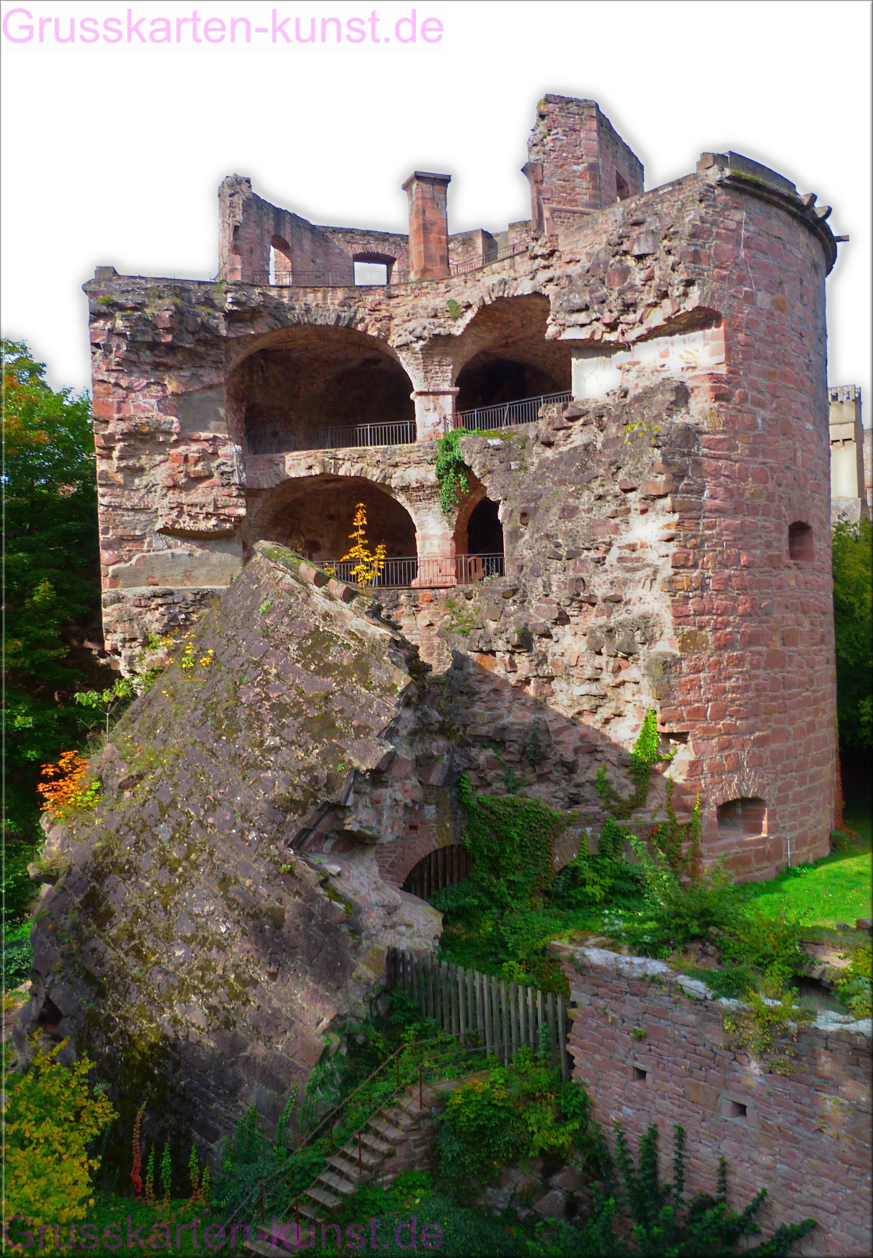 | R28 Blick auf den gesprengten Turm (Krautturm/Pulverturm) am Heidelberger Schloss. Der Turm wurde im Jahr 1693 von französischen Soldaten im Pfälzer Erbfolgekrieg gesprengt. Die mächtige Mauerschale ruht heute noch auf dem Schuttkegel von damals, was die Faszination des Bildes ausmacht. Etwa zwei Fünftel des runden, aus rotsandstein gemauerten Turmes sind abgebrochen und liegt angelehnt als fast komplettes Stück am noch intakten Turm. Überall in den Mauerritzen und Vorsprüngen wachsen herbstlich gelb-rote oder saftig grüne Bäume, Büsche, Ranken und Blumen. Das ganze steht inmitten des saftig grünen Burggartens mit einer Steintreppe zu verschiedenen Ebenen. Heute ragt der Turm, in dessen Innenleben man hier schaut, als Ruine immerhin noch 33 Meter hoch. Einer der Bewunderer dieser Ruine war J.W. Goethe, der diesen Turm 1779 zeichnete. Wunderbar! Foto: J. Cremer Mail mit der Karte R28 versenden Karte R28 vergrößern | |