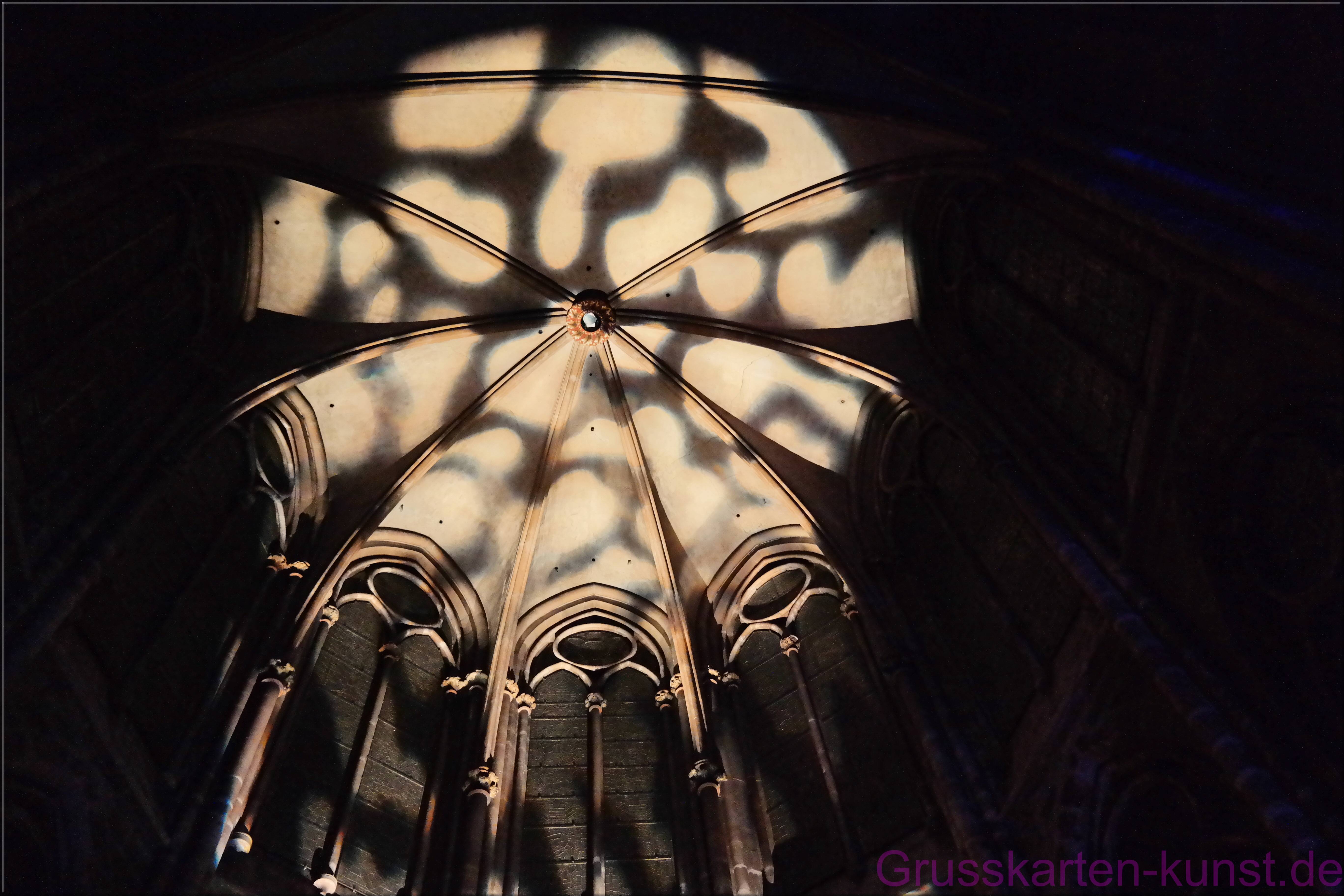 | R29 Hier schauen Sie in die von frühgotischen Fenstern getragene Deckenkonstuktion des hohen Chores in der Elisabethkirche Marburg. Das Interessante daran ist die bizarre Illumination aus natürlichem, gelben Licht, die die typische Kuppelbauweise auf besondere Art unterbricht bzw. in Szene setzt. Runder, im Lichtschein erstrahlender Anblick in luftige Höhen mit schattigem Rand. Hat was science fiction mäßiges. Mail mit der Karte R29 versenden Karte R29 vergrößern | |