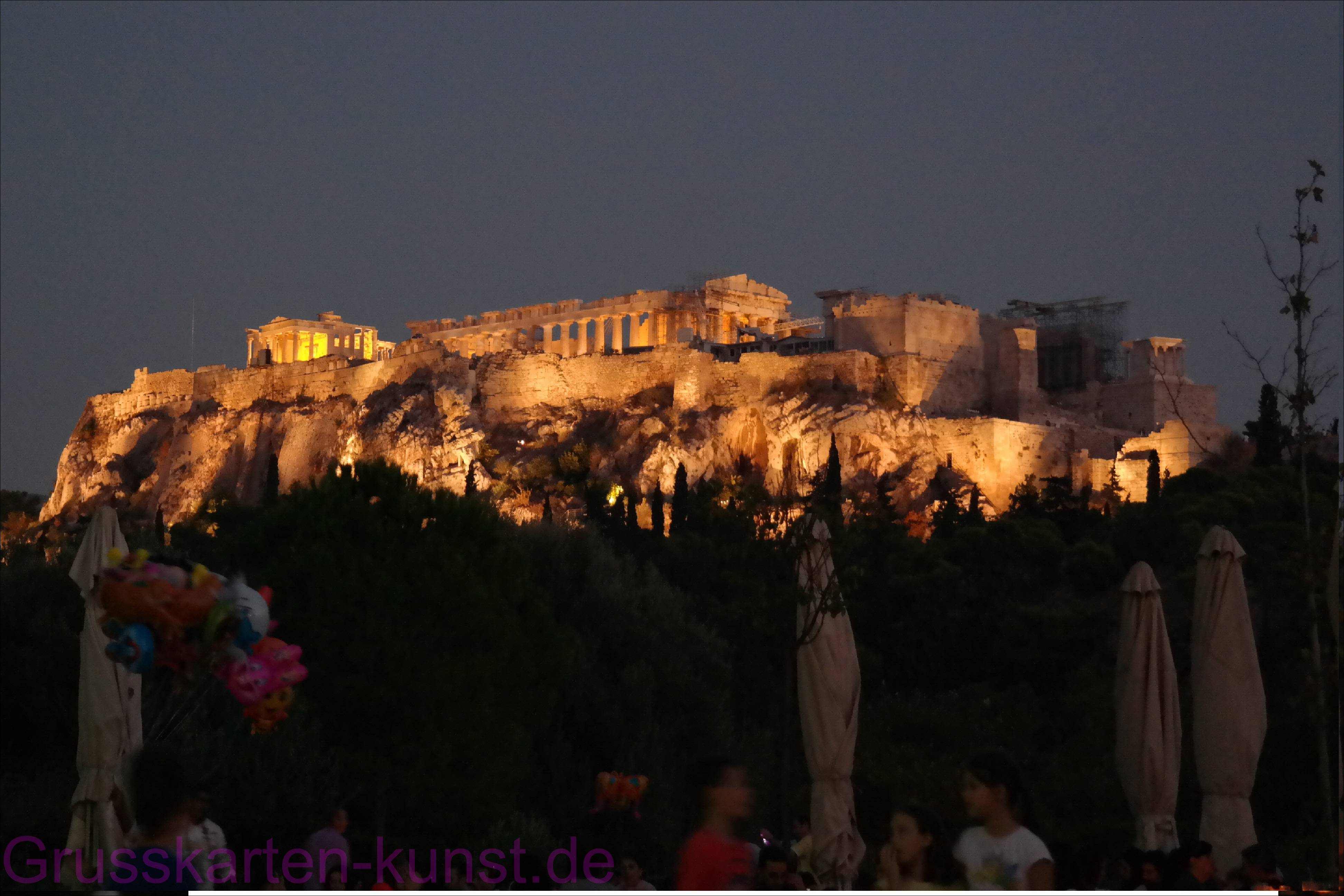 | R30 Blick von der südlichen Altstadt auf den felsigen Akropolisberg in der Dämmerung, auf dem die Überreste des Bauwerks durch warmes Licht erleuchtet werden. Im Gegensatz zu dem mächtigen Felsen mit teils senkrechten Abbruchstellen, wirkt der Bau der A. auf die Entfernung fast niedlich. Hat man den schönen Weg über Treppen und Absätze hindurch durch Zypressen geschafft und erreicht die ersten marmornen Stufen, scheint die erhabene Freiheit grenzenlos.Ein weiter Blick auf die ringsum liegende "weiße" Stadt bis hin zum Meer, verschlagen einem bei Tageslicht den Atem. Der Akropolisberg wird, wie hier auf dem Foto, bei Beginn der Dämmerung, nach und nach beleuchtet. Dabei entsteht ein faszinierendes Farbspiel, dass einzelne Teile in verschiedenen Farben schillern lässt. Das Foto zeigt warme goldgelbe und Kupfertöne, sowie den dunkelblauen Himmel und im Vordergrund sieht man Silhouetten von Sonnenschirmen, bunten Luftballons und Personen, die sich auf dem Platz mit Cafes u.ä. befinden. Eine warme Briese, der blaue Himmel und die mächtigen Marmorsäulen und Gebilde machen den Moment, an dem man den Gipfel erreicht, unvergesslich. Und doch ist man noch nicht am höchsten Punkt, denn in nicht allzu großer Entfernung erhebt sich ein weiteres Wahrzeichen Athens. Schaut man die steilen Felsklippen hinunter, kann man in Spielstätten und Arenen hinabgucken oder einen vorgelagerten Felsen bestaunen, auf dem man, wie an diesem Tag, die Sonne und den Ausblick in Ruhe genießen kann. Schaut man die Reste der Bauwerke an, fasziniert einen die Leichtigkeit der meterdicken Säulen, denn durch fehlende Wände und Teile hat man hier oben viel Luft. Unglaublich, dass Steine immer noch wie Puzzleteile sortiert, und Aufbau betrieben wird. Hier und da liegen träge Hunde und bewachen den Frieden. In etwa 10-15 Minuten kann man das höchste Plateau umrunden und Staunen. Der Anblick von unten am Abend hat einen besonderen Reiz. Für uns einer der schönsten Orte den wir zusammen mit Führhund Paula bestaunen durften. Mail mit der Karte R30 versenden Karte R30 vergrößern | |