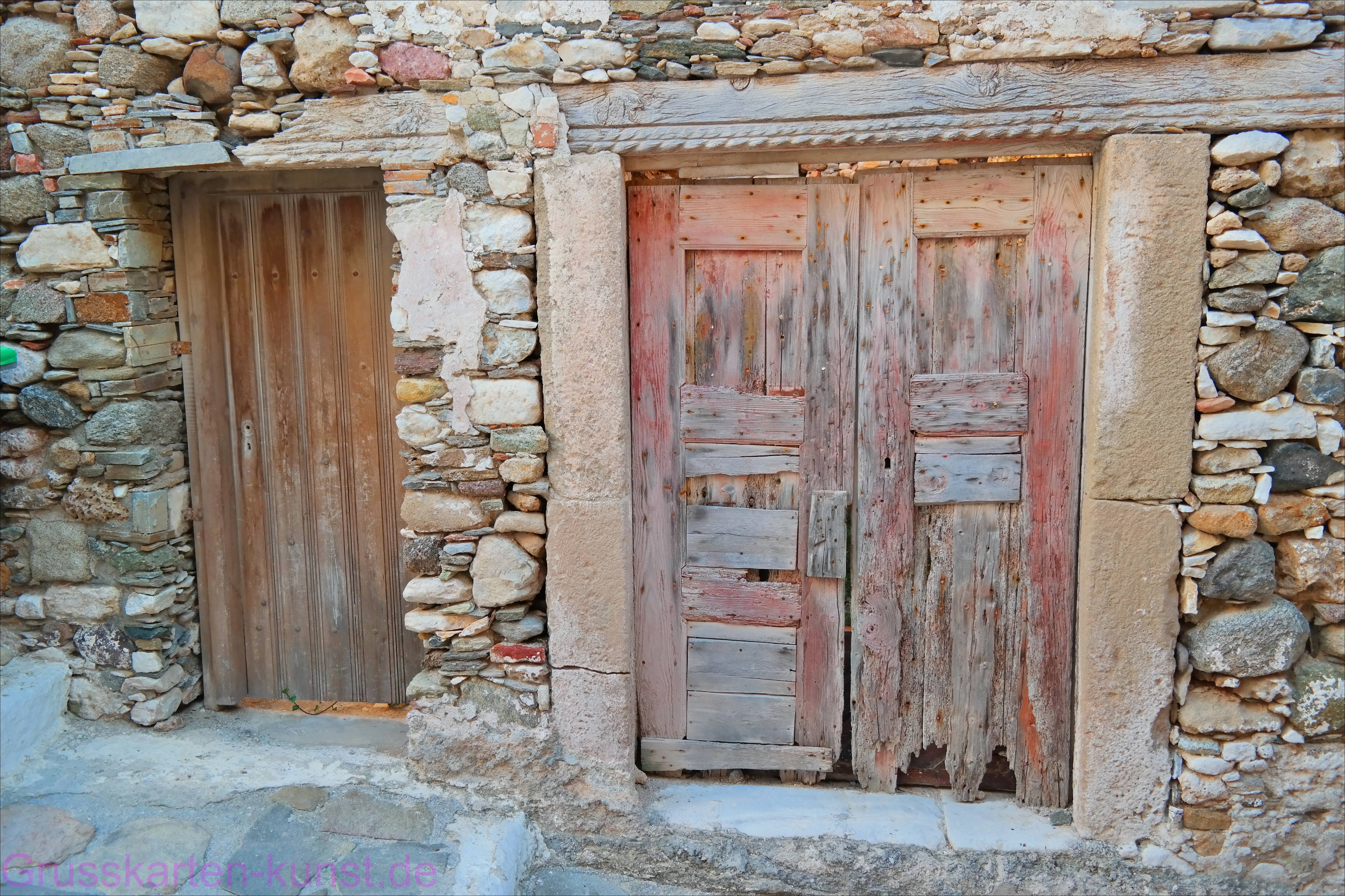 | R32 Zwei alte, schon sehr verfallene Holztüren, die dadurch eine fantastisch farbige Patina erhalten haben, bilden das Zentrum der Karte. Der Rest ist altes, ausgewaschenes Mauerwerk aus verschiedensten Steinen unterschiedlichster Farbe, Form und Größe, auch Marmor. Die Steine sind von Fußballgroß bis Streichholzschachtelklein z.T. fast lose wirkend gestapelt, vielleicht aus dem Meer gefischt. Sie bilden die Schutzmauer der alten Chora (Burg) der Stadt Naxos in Griechenland. Die Türen sind gelbbraun, graublau bis rötlich schimmernd mit zahlreichen Rissen, faulen Stellen und Löchern. Herrliches Altern ! Einfach schön anzusehen. Mail mit der Karte R32 versenden Karte R32 vergrößern | |