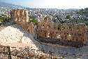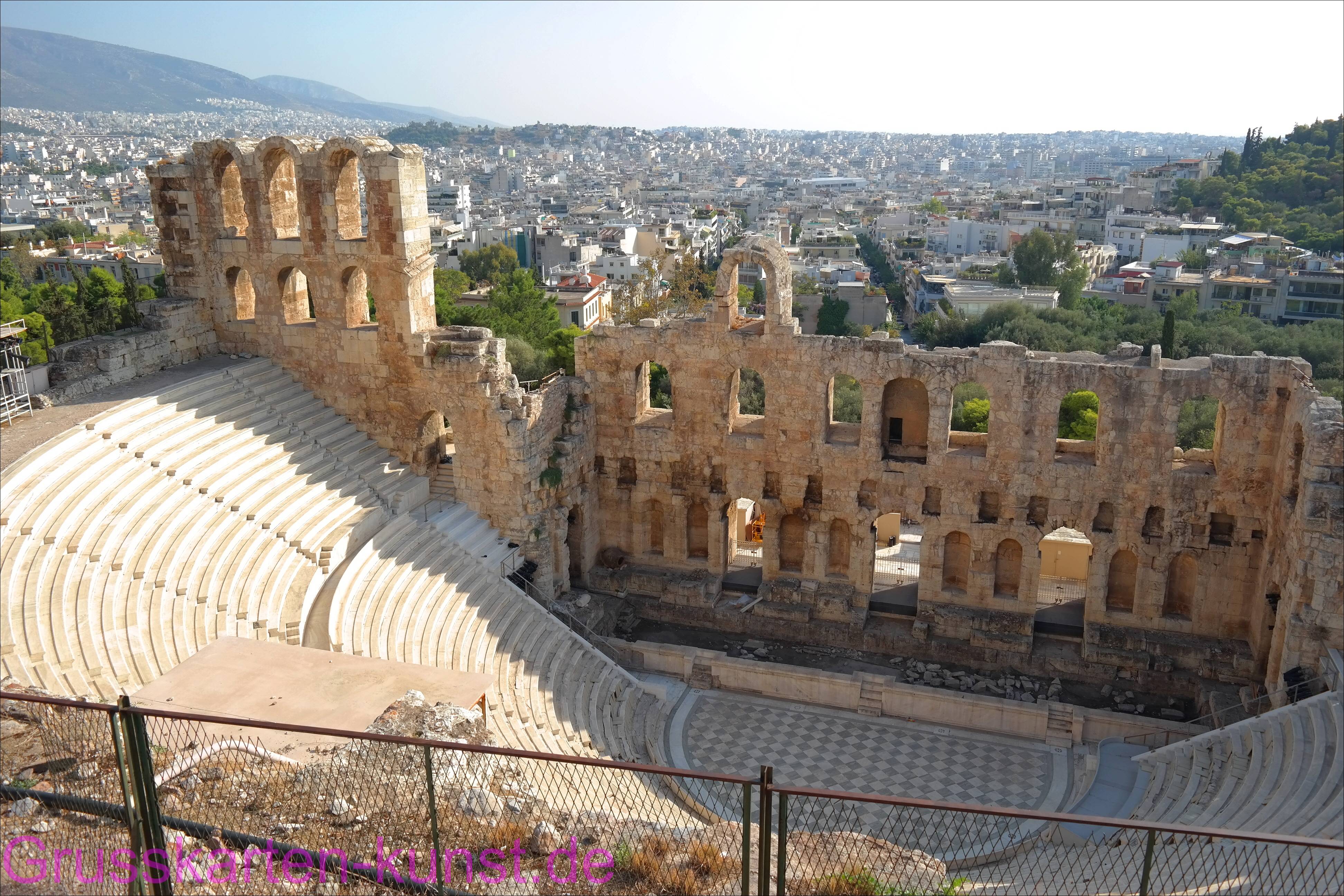 | R33 Sie blicken vom Akropolisberg hinab auf die südliche Seite, an dessen Hang sich das Dyonisustheater befindet. Sie schauen auf das schachbrettgemusterte Proskenion (Bühne), um die sich halbkreisförmig die 78 marmornen Sitzreichen den Hang hinauf, dem Betrachter entgegen gruppieren. Das alte Gemäuer hinter der Bühne und dem Orchestra, das sich z.T. gut erhalten und neu aufgebaut, steil gen Himmel streckt, hat halbrunde Fensteröffnungen, durch die von rechts vorne die Sonne blinzelt. Es schimmert in goldbraunen Marmorfarben und bildet optisch die Grenze zur dahinterliegenden Stadt, ihren zahllosen weißen Häusern, die sich bis an den Horizont zum blauen Himmel zu erstrecken scheint. Dazwischen locken die am Berg wachsenden grünen Zypressenbäume das Bild auf. Wie Steine und Blöcke gesichtet und durchnummeriert wieder an ihren alten Platz finden, ist uns ein Rätsel. Warme, stille, erhabene Stimmung. Mail mit der Karte R33 versenden Karte R33 vergrößern | |
