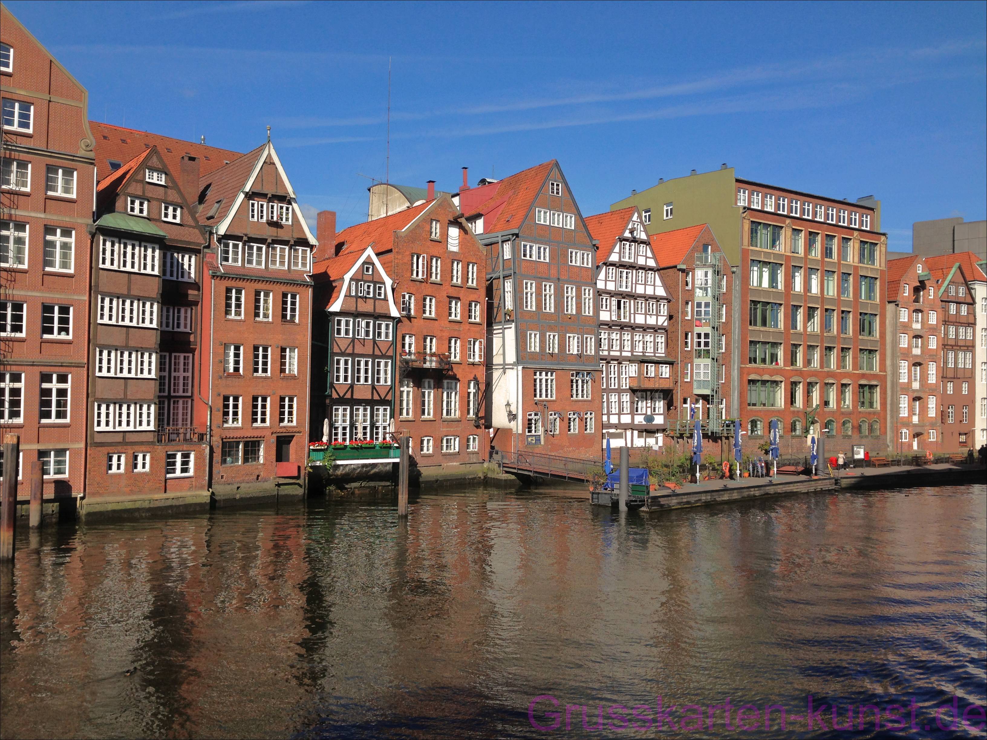 | R34 Sie schauen von der Fleetseite auf das Ensemble der historischen, alten Fachwerkhäuser, die direkt in Hambugs historischer Altstadt liegen (Deichstraße). Hier begann der Handel und Hamburgs Aufstieg. Die verschieden hohen, breiten, meist verklinkerten Giebelseiten der Häuser spiegeln sich im leicht welligen Fleetwasser. Weiße Sprossenfenster in verschiedenen Größen zieren die Häuser, die teils mit Blumenkästen und Terassen am Wasser versehen sind. Der blaue Himmel und das dunkle Wasser rahmen dieses dekorative Ambiente ein. Ein ruhiger, gemütlicher Ort inmitten einer pulsierenden Stadt. Mail mit der Karte R34 versenden Karte R34 vergrößern | |