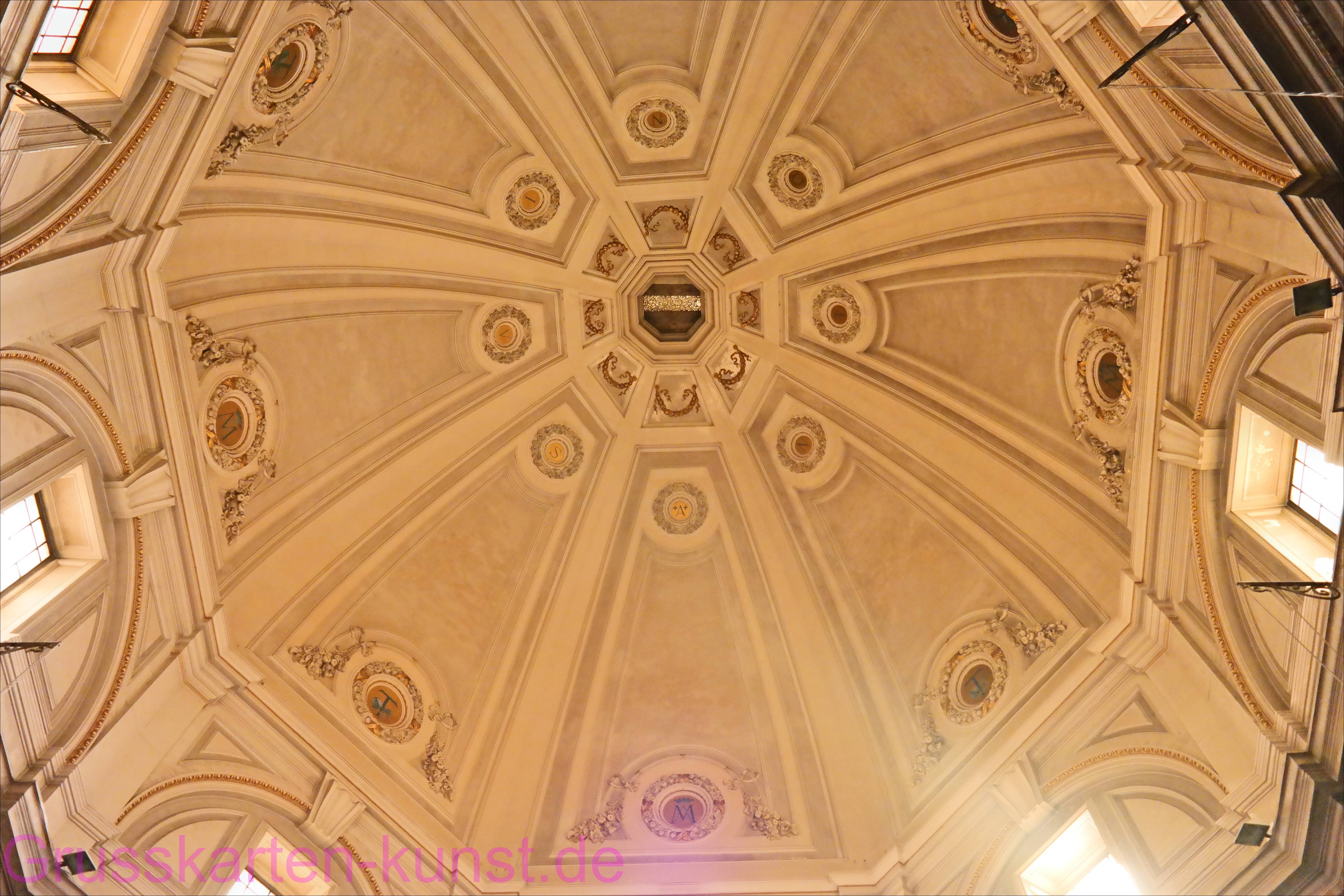 | R36 Sie schauen in die Kuppel der barocken Kirche Saint Antonio Abate in Cagliari, Italien. 8 recht- eckige Fenster, in rund gemauerten Umrandungen, sind außen in der achteckigen Kuppel zu sehen, durch einige scheint Licht, was diese Fotografie besonders macht. Über jedem Fenster erhebt sich ein dreieckig zur Kuppelmitte hinlaufendes Feld, das an der unteren und oberen Kante eine runde, scheinbar mit Blattgold besetzte Verzierung hat. Die Kuppelmitte ist etwas dunkler, mit einem gold glitzernden rechteckigen Fensterausschnitt. Die Kirchenkuppel zeichnet sich durch seine hellen, beigesandig abgesetzten Farbnuancen aus. Diese runde Geometrie mit geraden Elementen ist immer wieder ein schöner Anblick. Mail mit der Karte R36 versenden Karte R36 vergrößern | |