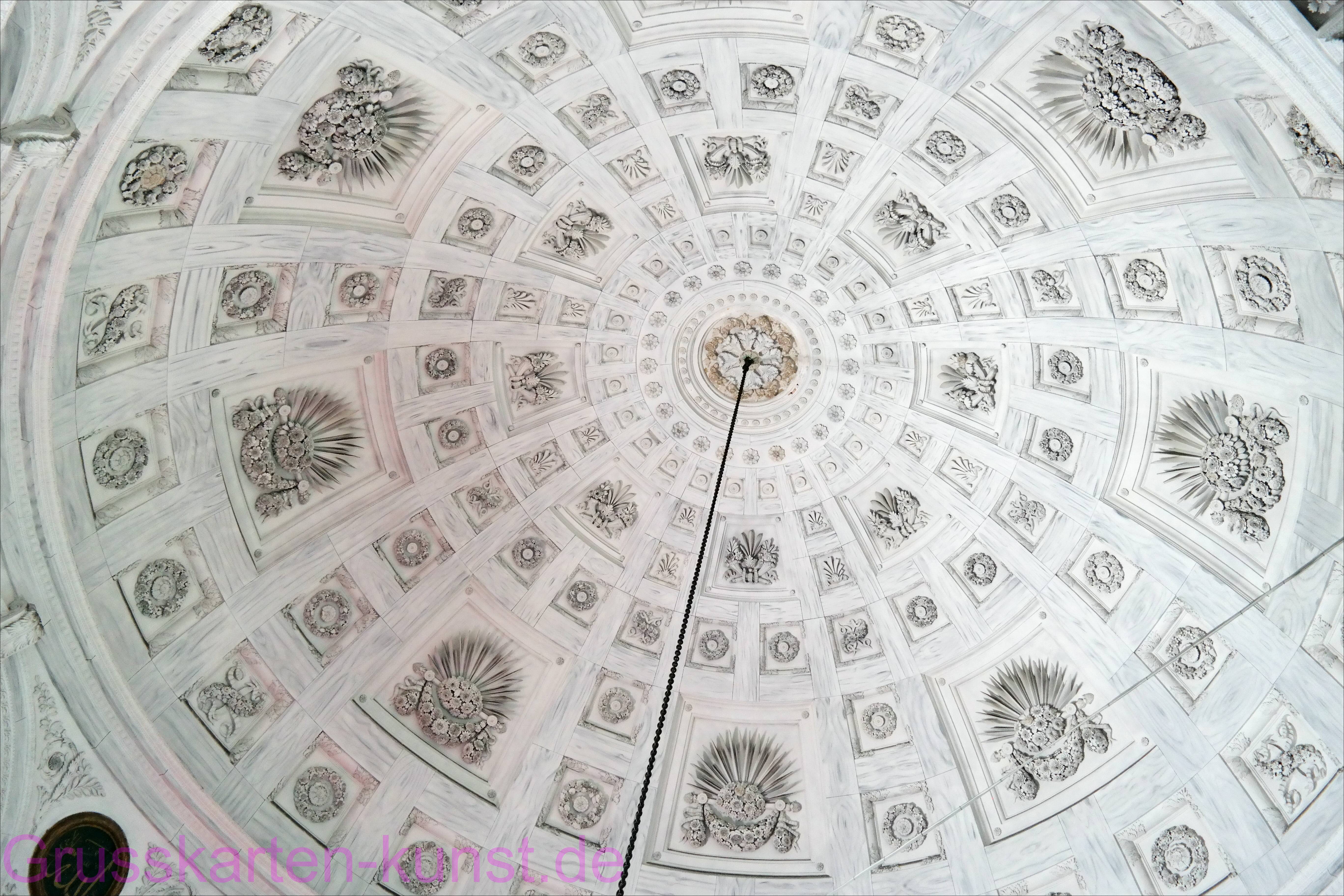 | R40 Hier sehen Sie die dem Hauptportal gegenüberliegende Kuppelseite. Warme aprikot- terracotta und weißtöne, sowie zartes Rot und Blau lassen die rundlichen Formen Kraft und Ruhe ausstrahlen. Unbeschreiblich und unvorstellbar, mit wie viel Hingabe diese filigrane Musterung entstand. Teilweise erinnern die Muster an geknüpfte Seidenteppiche. Mail mit der Karte R40 versenden Karte R40 vergrößern | |
